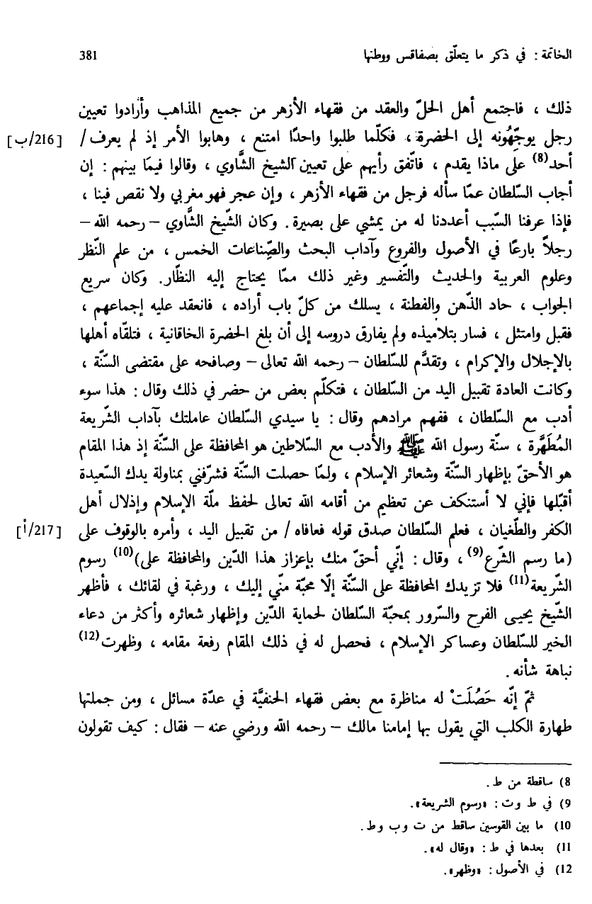 ذلك، فاجتمع أهل الحلّ والعقد من فقهاء الأزهر من جميع المذاهب وأرادوا تعيين رجل يوجّهونه إلى الحضرة، فكلّما طلبوا واحدا امتنع، وهابوا الأمر إذ لم يعرف / أحد (¬8) على ماذا يقدم، فاتّفق رأيهم على تعيين الشيخ الشّاوي، وقالوا فيما بينهم: إن أجاب السّلطان عمّا سأله فرجل من فقهاء الأزهر، وإن عجر فهو مغربي ولا نقص فينا، فإذا عرفنا السّبب أعددنا له من يمشي على بصيرة. وكان الشّيخ الشّاوي - رحمه الله - رجلا بارعا في الأصول والفروع وآداب البحث والصّناعات الخمس، من علم النّظر وعلوم العربية والحديث والتّفسير وغير ذلك ممّا يحتاج إليه النظّار. وكان سريع الجواب، حاد الذّهن والفطنة، يسلك من كلّ باب أراده، فانعقد عليه إجماعهم، فقبل وامتثل، فسار بتلاميذه ولم يفارق دروسه إلى أن بلغ الحضرة الخاقانية، فتلقّاه أهلها بالإجلال والإكرام، وتقدّم للسّلطان - رحمه الله تعالى - وصافحه على مقتضى السّنّة، وكانت العادة تقبيل اليد من السّلطان، فتكلّم بعض من حضر في ذلك وقال: هذا سوء أدب مع السّلطان، ففهم مرادهم وقال: يا سيدي السّلطان عاملتك بآداب الشّريعة المطهّرة، سنّة رسول الله صلّى الله عليه وسلم والأدب مع السّلاطين هو المحافظة على السّنّة إذ هذا المقام هو الأحقّ بإظهار السّنّة وشعائر الإسلام، ولمّا حصلت السّنّة فشرّفني بمناولة يدك السّعيدة أقبّلها فإني لا أستنكف عن تعظيم من أقامه الله تعالى لحفظ ملّة الإسلام وإذلال أهل الكفر والطّغيان، فعلم السّلطان صدق قوله فعافاه / من تقبيل اليد، وأمره بالوقوف على (ما رسم الشّرع (¬9)، وقال: إنّي أحقّ منك بإعزاز هذا الدّين والمحافظة على) (¬10) رسوم الشّريعة (¬11) فلا تزيدك المحافظة على السّنّة إلاّ محبّة منّي إليك، ورغبة في لقائك، فأظهر الشّيخ يحيى الفرح والسّرور بمحبّة السّلطان لحماية الدّين وإظهار شعائره وأكثر من دعاء الخير للسّلطان وعساكر الإسلام، فحصل له في ذلك المقام رفعة مقامه، وظهرت (¬12) نباهة شأنه.