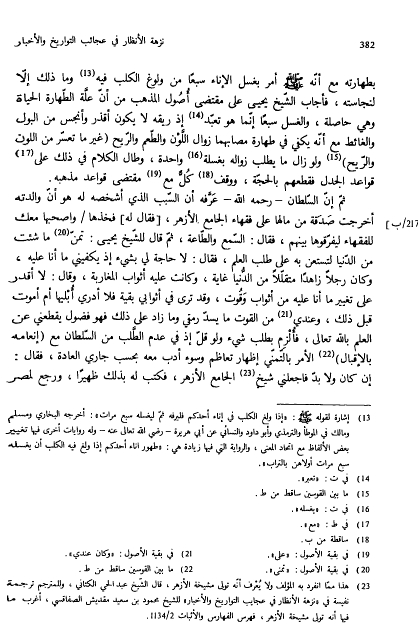 (¬23) هذا ممّا انفرد به المؤلف ولا يعرف أنّه تولى مشيخة الأزهر، قال الشّيخ عبد الحي الكتاني، وللمترجم ترجمة نفيسة في «نزهة الأنظار في عجايب التواريخ والأخبار» للشيخ محمود بن سعيد مقديش الصفاقسي، أغرب ما فيها أنه تولى مشيخة الأزهر، فهرس الفهارس والأثبات 2/ 1134.