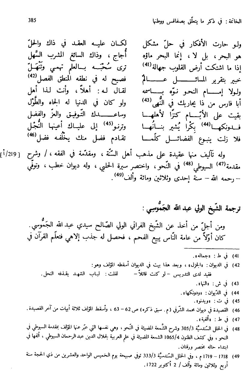 (¬48) في الحلل السّندسيّة 3/ 305 وشرح الشّمعة المضيئة في النّحو، وهي نفسها التي عبّر عنها المؤلف بمقدمة السيوطي في النحو، وفي كشف الظنون 4/ 1065 الشمعة المضيئة في علم العربية لجلال الدين عبد الرحمان السيوطي، ألفها في ابتداء حاله مختصر ورقتان.