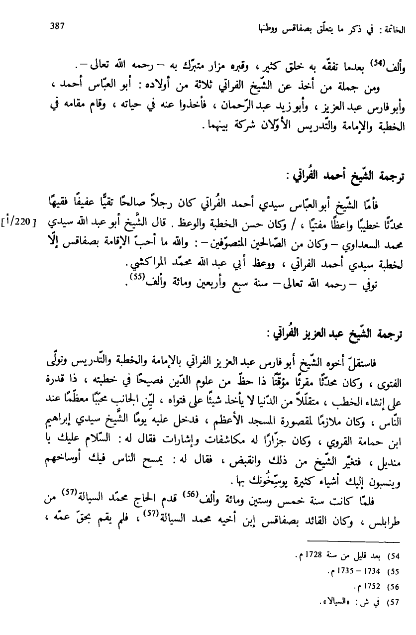 فأمّا الشّيخ أبو العبّاس سيدي أحمد الفراتي كان رجلا صالحا تقيّا عفيفا فقيها محدّثا خطيبا واعظا مفتيا، / وكان حسن الخطبة والوعظ. قال الشّيخ أبو عبد الله سيدي محمد السعداوي - وكان من الصّالحين المتصوّفين -: والله ما أحبّ الإقامة بصفاقس إلاّ لخطبة سيدي أحمد الفراتي، ووعظ أبي عبد الله محمّد المراكشي.