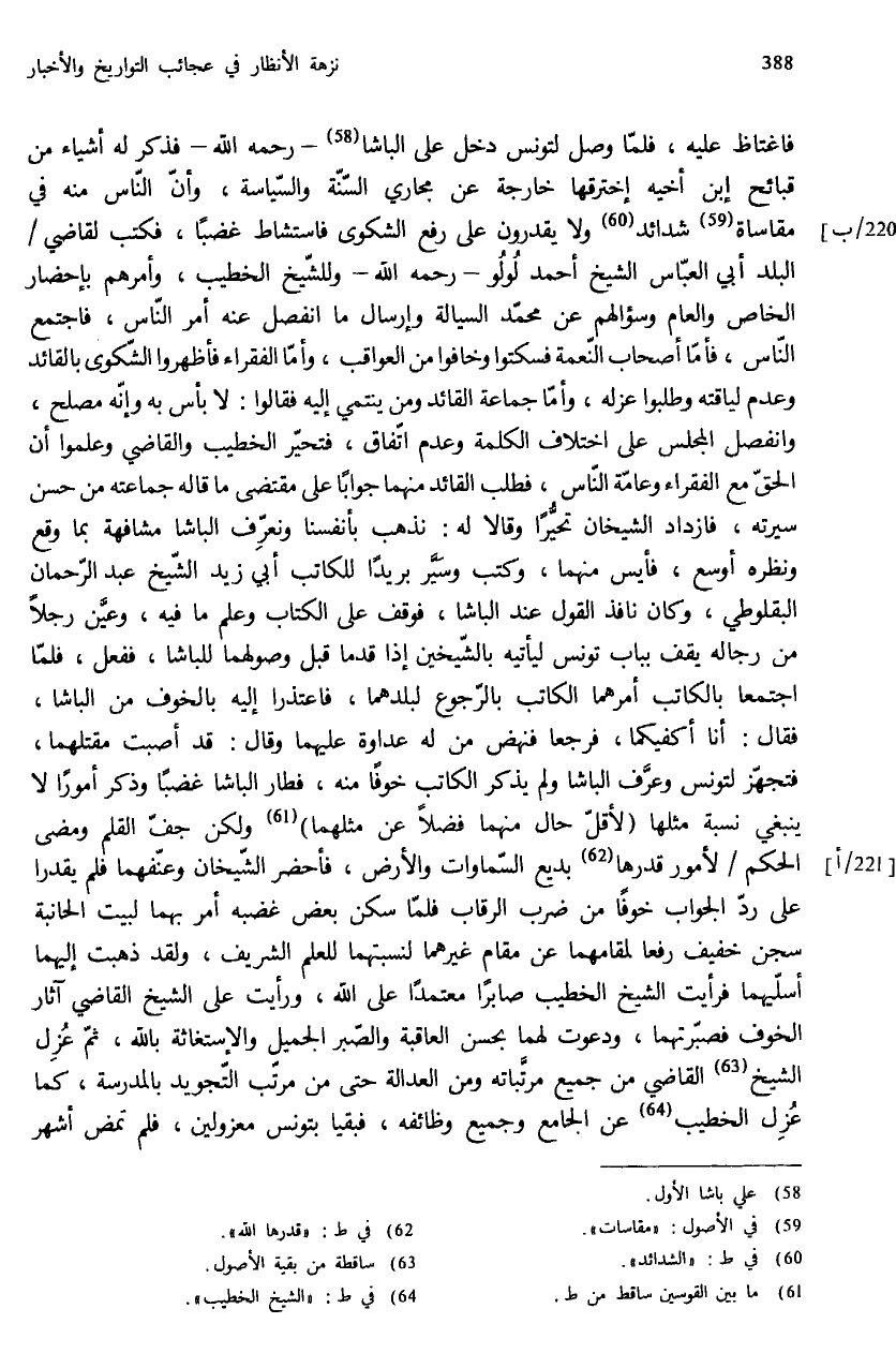 فاغتاظ عليه، فلمّا وصل لتونس دخل على الباشا (¬58) - رحمه الله - فذكر له أشياء من قبائح إبن أخيه إخترقها خارجة عن مجاري السّنّة والسّياسة، وأنّ النّاس منه في مقاساة (¬59) شدائد (¬60) ولا يقدرون على رفع الشكوى فاستشاط غضبا، فكتب لقاضي / البلد أبي العبّاس الشيخ أحمد لولو - رحمه الله - وللشّيخ الخطيب، وأمرهم بإحضار الخاص والعام وسؤالهم عن محمّد السيالة وإرسال ما انفصل عنه أمر النّاس، فاجتمع النّاس، فأمّا أصحاب النّعمة فسكتوا وخافوا من العواقب، وأمّا الفقراء فأظهروا الشّكوى بالقائد وعدم لياقته وطلبوا عزله، وأمّا جماعة القائد ومن ينتمي إليه فقالوا: لا بأس به وإنّه مصلح، وانفصل المجلس على اختلاف الكلمة وعدم اتّفاق، فتحيّر الخطيب والقاضي وعلموا أن الحقّ مع الفقراء وعامّة النّاس، فطلب القائد منهما جوابا على مقتضى ما قاله جماعته من حسن سيرته، فازداد الشيخان تحيّرا وقالا له: نذهب بأنفسنا ونعرّف الباشا مشافهة بما وقع ونظره أوسع، فأيس منهما، وكتب وسيّر بريدا للكاتب أبي زيد الشّيخ عبد الرّحمان البقلوطي، وكان نافذ القول عند الباشا، فوقف على الكتاب وعلم ما فيه، وعيّن رجلا من رجاله يقف بباب تونس ليأتيه بالشّيخين إذا قدما قبل وصولهما للباشا، ففعل، فلمّا اجتمعا بالكاتب أمرهما الكاتب بالرّجوع لبلدهما، فاعتذرا إليه بالخوف من الباشا، فقال: أنا أكفيكما، فرجعا فنهض من له عداوة عليهما وقال: قد أصبت مقتلهما، فتجهّز لتونس وعرّف الباشا ولم يذكر الكاتب خوفا منه، فطار الباشا غضبا وذكر أمورا لا ينبغي نسبة مثلها (لأقلّ حال منهما فضلا عن مثلهما) (¬61) ولكن جفّ القلم ومضى الحكم / لأمور قدرها (¬62) بديع السّماوات والأرض، فأحضر الشّيخان وعنّفهما فلم يقدرا على ردّ الجواب خوفا من ضرب الرقاب فلمّا سكن بعض غضبه أمر بهما لبيت الحانية سجن خفيف رفعا لمقامهما عن مقام غيرهما لنسبتهما للعلم الشريف، ولقد ذهبت إليهما أسلّيهما فرأيت الشيخ الخطيب صابرا معتمدا على الله، ورأيت على الشيخ القاضي آثار الخوف فصبّرتهما، ودعوت لهما بحسن العاقبة والصّبر الجميل والإستغاثة بالله، ثمّ عزل الشيخ (¬63) القاضي من جميع مرتّباته ومن العدالة حتى من مرتّب التّجويد بالمدرسة، كما عزل الخطيب (¬64) عن الجامع وجميع وظائفه، فبقيا بتونس معزولين، فلم تمض أشهر