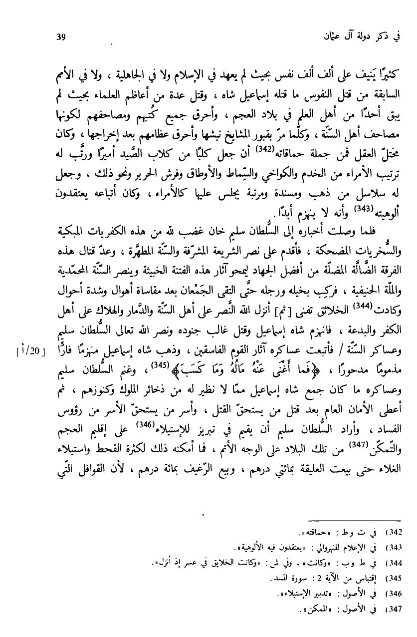 فلما وصلت أخباره إلى السّلطان سليم خان غضب لله من هذه الكفريات المبكية والسّخريات المضحكة، فأقدم على نصر الشريعة المشرّفة والسّنّة المطهّرة، وعدّ قتال هذه الفرقة الضّالّة المضلّة من أفضل الجهاد ليمحو آثار هذه الفتنة الخبيثة وينصر السّنّة المحمّدية والملّة الحنيفية، فركب بخيله ورجله حتّى التقى الجمعان بعد مقاساة أهوال وشدة أحوال وكادت (¬344) الخلائق تفنى [ثم] أنزل الله النّصر على أهل السّنّة والدّمار والهلاك على أهل الكفر والبدعة، فانهزم شاه إسماعيل وقتل غالب جنوده ونصر الله تعالى السّلطان سليم وعساكر السّنّة / فأتبعت عساكره آثار القوم الفاسقين، وذهب شاه إسماعيل منهزما فارّا مذموما مدحورا، {ما أَغْنى عَنْهُ مالُهُ وَما كَسَبَ} (¬345)، وغنم السّلطان سليم وعساكره ما كان جمع شاه إسماعيل ممّا لا نظير له من ذخائر الملوك وكنوزهم، ثم أعطى الأمان العام بعد قتل من يستحقّ القتل، وأسر من يستحقّ الأسر من رؤوس الفساد، وأراد السّلطان سليم أن يقيم في تبريز للإستيلاء (¬346) على إقليم العجم والتّمكّن (¬347) من تلك البلاد على الوجه الأتم، فما أمكنه ذلك لكثرة القحط واستيلاء الغلاء حتى بيعت العليقة بمائتي درهم، وبيع الرّغيف بمائة درهم، لأن القوافل الّتي