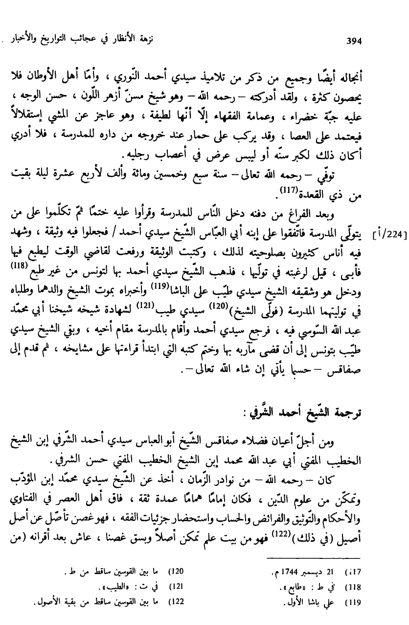 ومن أجلّ أعيان فضلاء صفاقس الشّيخ أبو العباس سيدي أحمد الشّرفي إبن الشيخ الخطيب المفتي أبي عبد الله محمد إبن الشيخ الخطيب المفتي حسن الشرفي.