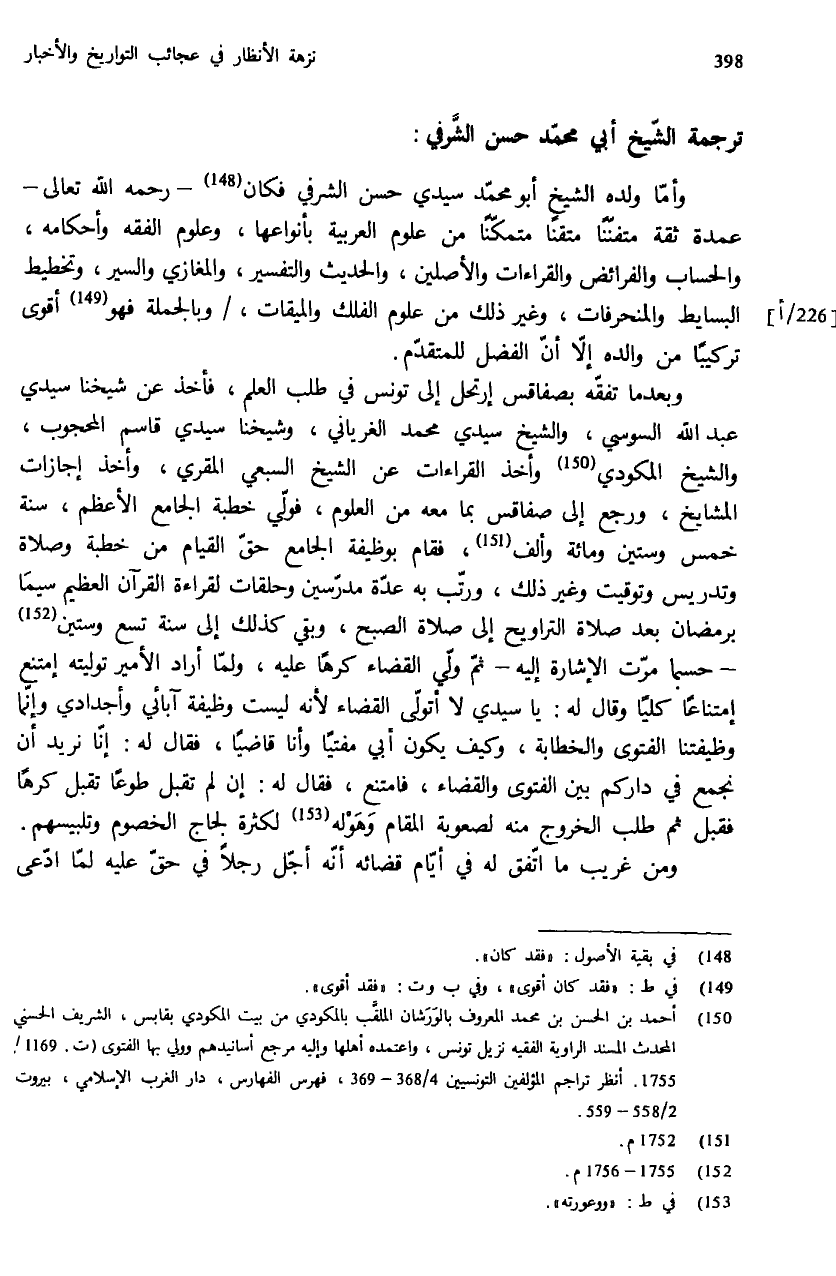 (¬150) أحمد بن الحسن بن محمد المعروف بالورشان الملقّب بالمكودي من بيت المكودي بقابس، الشريف الحسني المحدث المسند الراوية الفقيه نزيل تونس، واعتمده أهلها وإليه مرجع أسانيدهم وولي بها الفتوى (ت.1169/ 1755. أنظر تراجم المؤلفين التونسيين 4/ 368 - 369، فهرس الفهارس، دار الغرب الإسلامي، بيروت 2/ 558 - 559.