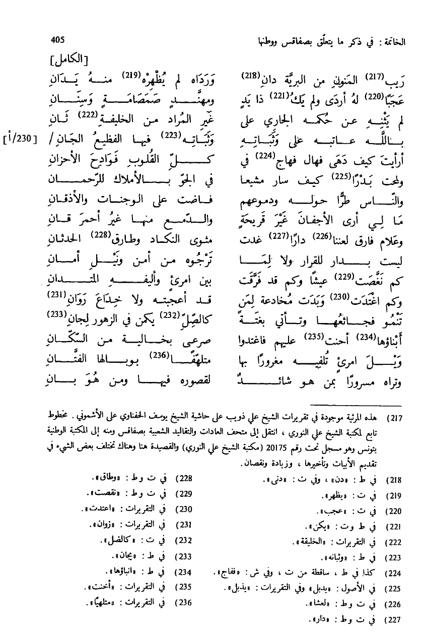(¬217) هذه المرثية موجودة في تقريرات الشيخ علي ذويب على حاشية الشيخ يوسف الحفناوي على الأشموني. مخطوط تابع لمكتبة الشيخ علي النوري، انتقل إلى متحف العادات والتقاليد الشعبية بصفاقس ومنه إلى المكتبة الوطنية بتونس وهو مسجل تحت رقم 20175 (مكتبة الشيخ علي النوري) والقصيدة هنا وهناك تختلف بعض الشيء في تقديم الأبيات وتأخيرها، وزيادة ونقصان.