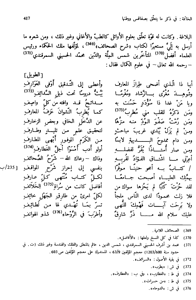 البلاغة. وكانت له قوّة تعلّق بعلوم الأوائل كالطبّ والأغاني وغير ذلك، ومن شعره ما أرسل به إليّ مستعيرا لكتاب «شرح الصحائف» (¬369)، لمؤلّفها ملك الحكماء ورئيس العلماء أفضل (¬370) المتأخّرين شمس الملّة والدّين محمّد الحسيني السمرقندي (¬371) - رحمه الله تعالى - في علوم الكمال فقال: