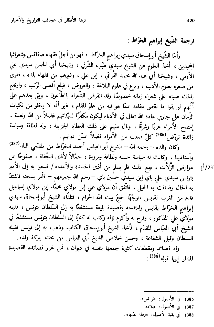 وأمّا الشّيخ أبو إسحاق سيدي إبراهيم الخرّاط، فهو من أجلّ فقهاء صفاقس وشعرائها المجيدين، أخذ العلوم عن الشيخ سيدي طيّب الشّرفي، وشيخنا أبي الحسن سيدي علي الأومي، وشيخنا أبي عبد الله محمد الفراتي، إبن علي، وغيرهم من فقهاء بلده، فغرى من صغره بعلوم الأدب، وبرع في علوم البلاغة، والعروض، فبلغ أقصى الرّتب، وارتفع بذلك صيته على شعراء زمانه خصوصا وقد انقرض الشّعراء بالطّاعون، وبقي بعدهم على أنّهم لو بقوا ما نقص مقامه عمّا هو فيه من علوّ المقام، غير أنّه لا يخلو من نكبات الزّمان على جاري عادة الله تعالى في الأدباء ليكون مكفّرا لسيّئاتهم فضلا من الله ونعمة، إمتدح الأمراء غربا وشرقا، ونال منهم على ذلك العطايا الجزيلة، وله لطافة وسياسة زائدة تروّض (¬386) كلّ صعب من الأمراء فضلا عمّن دونهم.