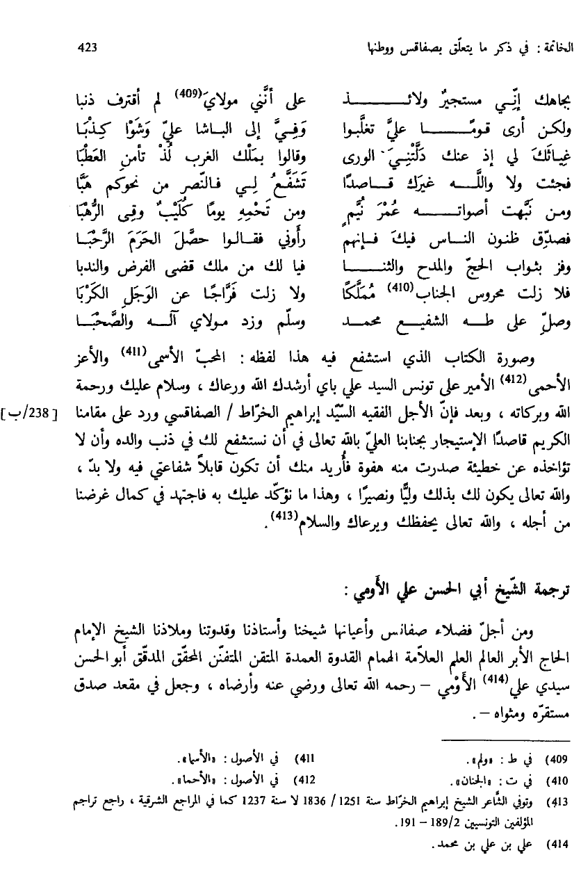 ومن أجلّ فضلاء صفاقس وأعيانها شيخنا وأستاذنا وقدوتنا وملاذنا الشيخ الإمام الحاج الأبر العالم العلم العلاّمة الهمام القدوة العمدة المتقن المتفنّن المحقّق المدقّق أبو الحسن سيدي علي (¬414) الأومي - رحمه الله تعالى ورضي عنه وأرضاه، وجعل في مقعد صدق مستقرّه ومثواه -.