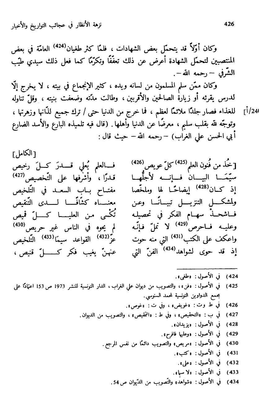 (¬425) في الأصول: «فن»، والتصويب من ديوان علي الغراب، الدار التونسية للنشر 1973 ص: 153 اعتمادا على مجمع الدواوين التونسية لمحمد السنوسي.