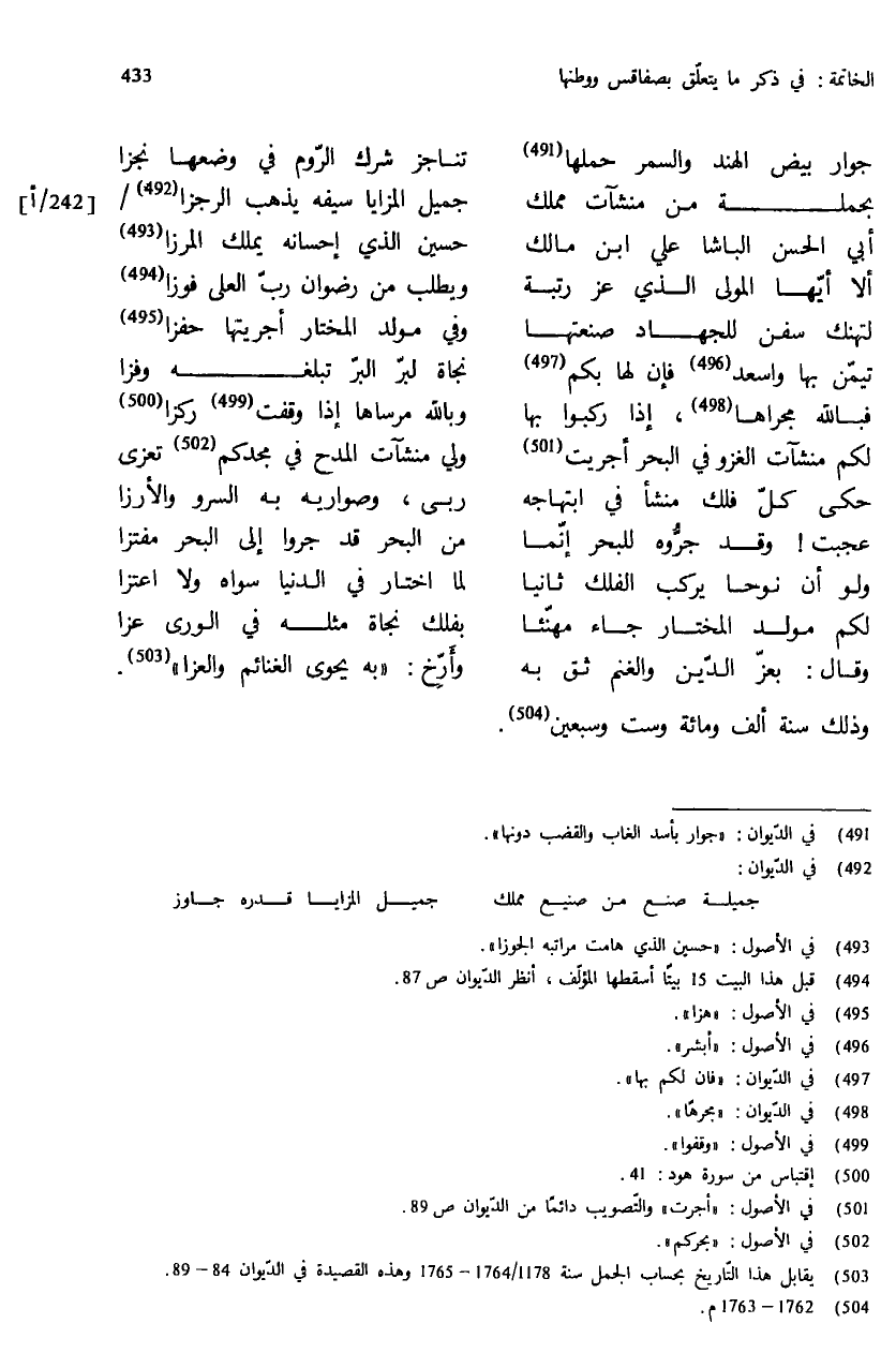 (¬503) يقابل هذا التّاريخ بحساب الجمل سنة 1178/ 1764 - 1765 وهذه القصيدة في الدّيوان 84 - 89.