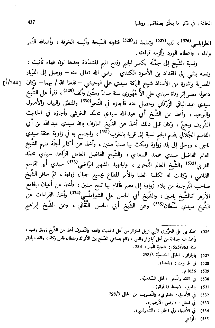 الطرابلسي (¬526)، لقيه (¬527) وتتلمذ له (¬528) فناوله السّبحة وألبسه الخرقة، وأضافه التّمر والماء، وأعطاه الورد وألزمه قراءته.