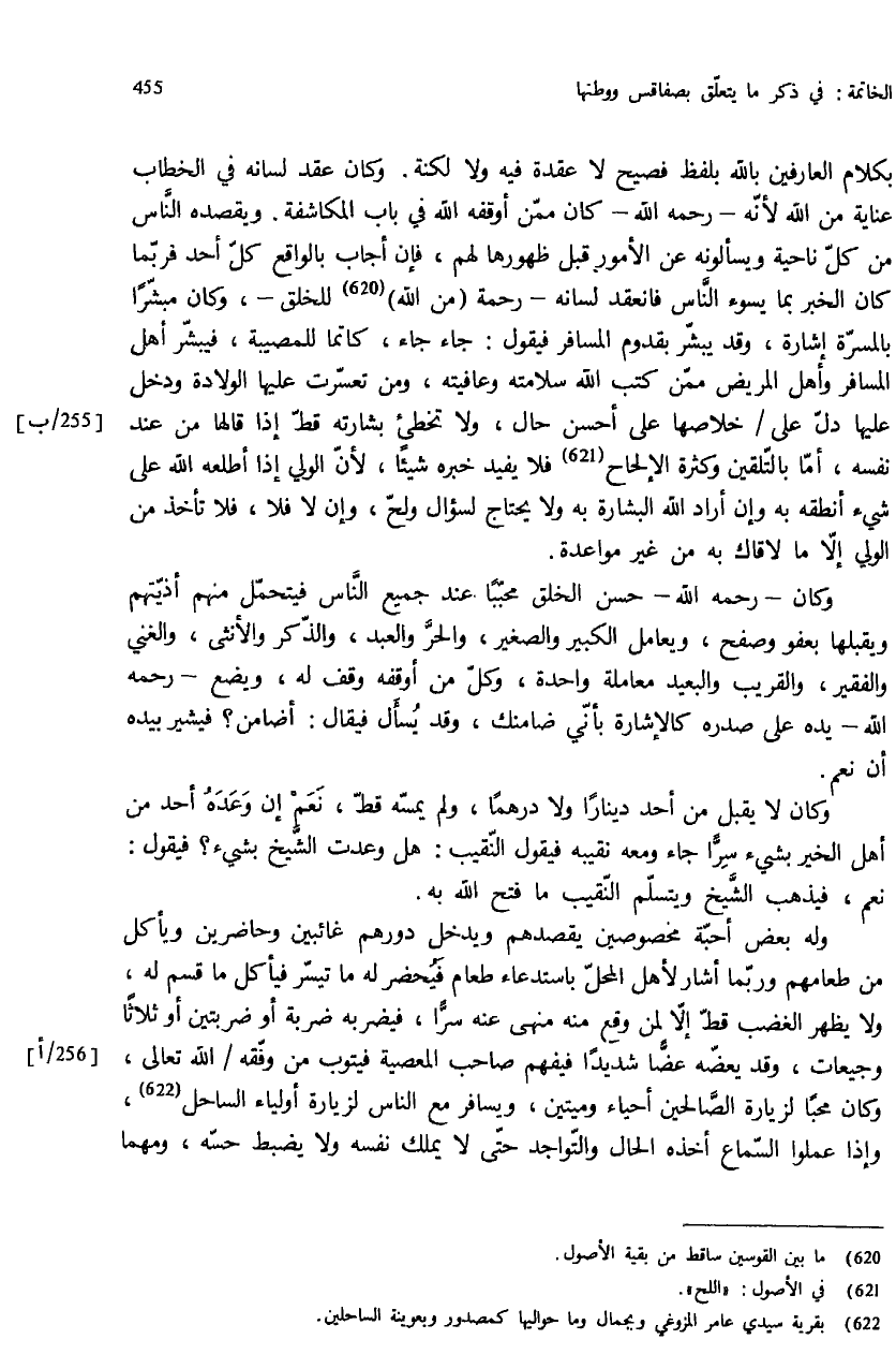 بكلام العارفين بالله بلفظ فصيح لا عقدة فيه ولا لكنة. وكان عقد لسانه في الخطاب عناية من الله لأنّه - رحمه الله - كان ممّن أوقفه الله في باب المكاشفة. ويقصده النّاس من كلّ ناحية ويسألونه عن الأمور قبل ظهورها لهم، فإن أجاب بالواقع كلّ أحد فربّما كان الخبر بما يسوء النّاس فانعقد لسانه - رحمة (من الله) (¬620) للخلق -، وكان مبشّرا بالمسرّة إشارة، وقد يبشّر بقدوم المسافر فيقول: جاء جاء، كاتما للمصيبة، فيبشّر أهل المسافر وأهل المريض ممّن كتب الله سلامته وعافيته، ومن تعسّرت عليها الولادة ودخل عليها دلّ على / خلاصها على أحسن حال، ولا تخطئ بشارته قطّ إذا قالها من عند نفسه، أمّا بالتّلقين وكثرة الإلحاح (¬621) فلا يفيد خبره شيئا، لأنّ الولي إذا أطلعه الله على شيء أنطقه به وإن أراد الله البشارة به ولا يحتاج لسؤال ولحّ، وإن لا فلا، فلا تأخذ من الولي إلاّ ما لاقاك به من غير مواعدة.