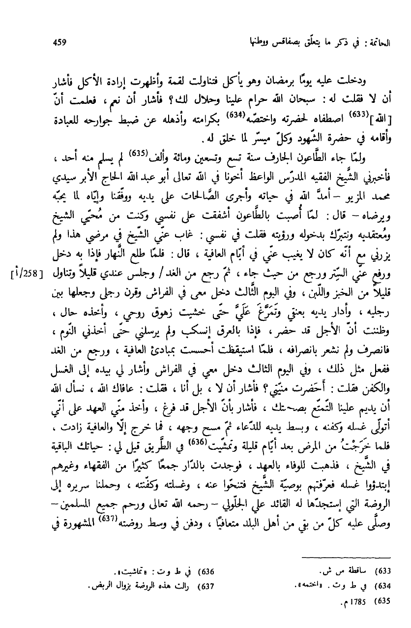 ولمّا جاء الطّاعون الجارف سنة تسع وتسعين ومائة وألف (¬635) لم يسلم منه أحد، فأخبرني الشّيخ الفقيه المدرّس الواعظ أخونا في الله تعالى أبو عبد الله الحاج الأبر سيدي محمد المزيو - أمدّ الله في حياته وأجرى الصّالحات على يديه ووفّقنا وإيّاه لما يحبّه ويرضاه - قال: لمّا أصبت بالطّاعون أشفقت على نفسي وكنت من محيّي الشيخ ومعتقديه ونتبرّك بدخوله ورؤيته فقلت في نفسي: غاب عنّي الشّيخ في مرضي هذا ولم يزرني مع أنّه كان لا يغيب عنّي في أيّام العافية، قال: فلمّا طلع النّهار فإذا به دخل ورفع عنّي السّتر ورجع من حيث جاء، ثمّ رجع من الغد / وجلس عندي قليلا وتناول قليلا من الخبز واللّبن، وفي اليوم الثّالث دخل معى في الفراش وقرن رجلى وجعلها بين رجليه، وأدار يديه بعنقي وتمرّغ عليّ حتّى خشيت زهوق روحي، وأخذه حال، وظننت أنّ الأجل قد حضر، فإذا بالعرق إنسكب ولم يرسلني حتّى أخذني النّوم، فانصرف ولم نشعر بانصرافه، فلمّا استيقظت أحسست بمبادئ العافية، ورجع من الغد ففعل مثل ذلك، وفي اليوم الثالث دخل معي في الفراش وأشار لي بيده إلى الغسل والكفن فقلت: أحضرت منيّتي؟ فأشار أن لا، بل أنا، فقلت: عافاك الله، نسأل الله أن يديم علينا التّمتّع بصحتك، فأشار بأنّ الأجل قد فرغ، وأخذ منّي العهد على أنّي أتولّى غسله وكفنه، وبسط يديه للدّعاء ثمّ مسح وجهه، فما خرج إلاّ والعافية زادت، فلما خرجت من المرض بعد أيّام قليلة وتمشّيت (¬636) في الطّريق قيل لي: حياتك الباقية في الشّيخ، فذهبت للوفاء بالعهد، فوجدت بالدّار جمعا كثيرا من الفقهاء وغيرهم إبتدؤوا غسله فعرّفتهم بوصيّة الشّيخ فتنحّوا عنه، وغسلته وكفّنته، وحملنا سريره إلى الروضة التي إستجدّها له القائد علي الجلّولي - رحمه الله تعالى ورحم جميع المسلمين - وصلّى عليه كلّ من بقي من أهل البلد متعافيا، ودفن في وسط روضته (¬637) المشهورة في