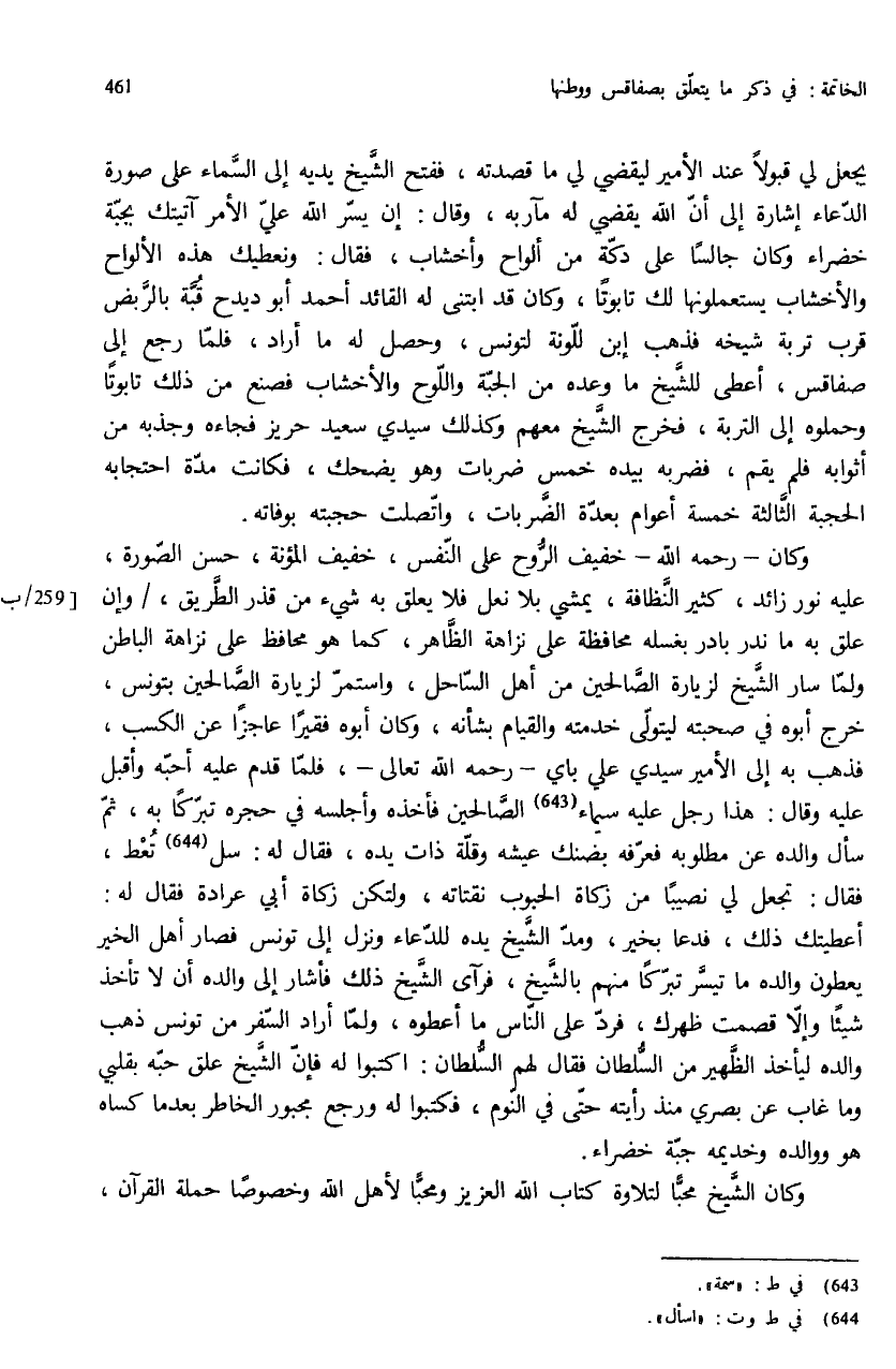 وكان - رحمه الله - خفيف الرّوح على النّفس، خفيف المؤنة، حسن الصّورة، عليه نور زائد، كثير النّظافة، يمشي بلا نعل فلا يعلق به شيء من قذر الطّريق، / وإن علق به ما ندر بادر بغسله محافظة على نزاهة الظّاهر، كما هو محافظ على نزاهة الباطن ولمّا سار الشّيخ لزيارة الصّالحين من أهل السّاحل، واستمرّ لزيارة الصّالحين بتونس، خرج أبوه في صحبته ليتولّى خدمته والقيام بشأنه، وكان أبوه فقيرا عاجزا عن الكسب، فذهب به إلى الأمير سيدي علي باي - رحمه الله تعالى -، فلمّا قدم عليه أحبّه وأقبل عليه وقال: هذا رجل عليه سيماء (¬643) الصّالحين فأخذه وأجلسه في حجره تبرّكا به، ثمّ سأل والده عن مطلوبه فعرّفه بضنك عيشه وقلّة ذات يده، فقال له: سل (¬644) تعط، فقال: تجعل لي نصيبا من زكاة الحبوب نقتاته، ولتكن زكاة أبي عرادة فقال له: