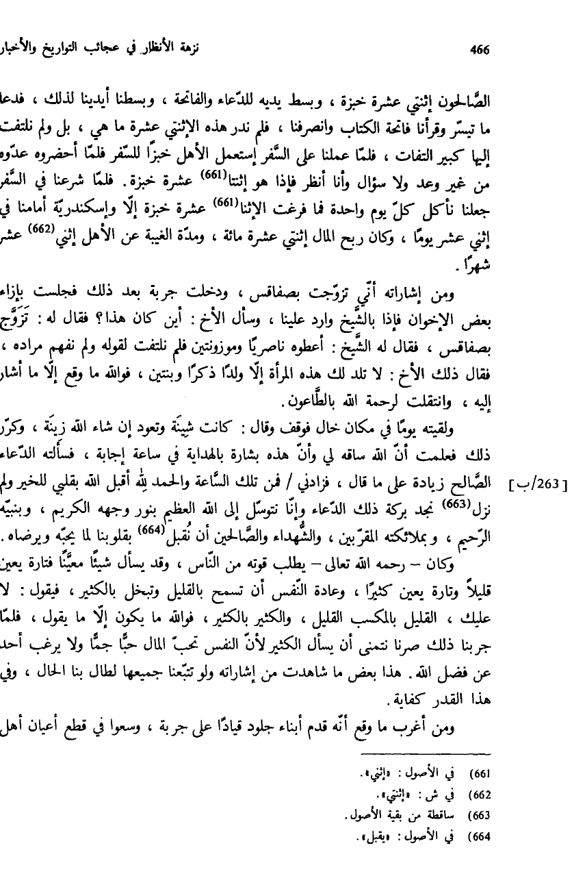 الصّالحون إثنتي عشرة خبزة، وبسط يديه للدّعاء والفاتحة، وبسطنا أيدينا لذلك، فدعا ما تيسّر وقرأنا فاتحة الكتاب وانصرفنا، فلم ندر هذه الإثنتي عشرة ما هي، بل ولم نلتفت إليها كبير التفات، فلمّا عملنا على السّفر إستعمل الأهل خبزا للسّفر فلمّا أحضروه عدّوه من غير وعد ولا سؤال وأنا أنظر فإذا هو إثنتا (661) عشرة خبزة. فلمّا شرعنا في السّفر جعلنا نأكل كلّ يوم واحدة فما فرغت الإثنا (¬661) عشرة خبزة إلاّ وإسكندريّة أمامنا في إثني عشر يوما، وكان ربح المال إثني عشرة مائة، ومدّة الغيبة عن الأهل إثني (¬662) عشر شهرا.