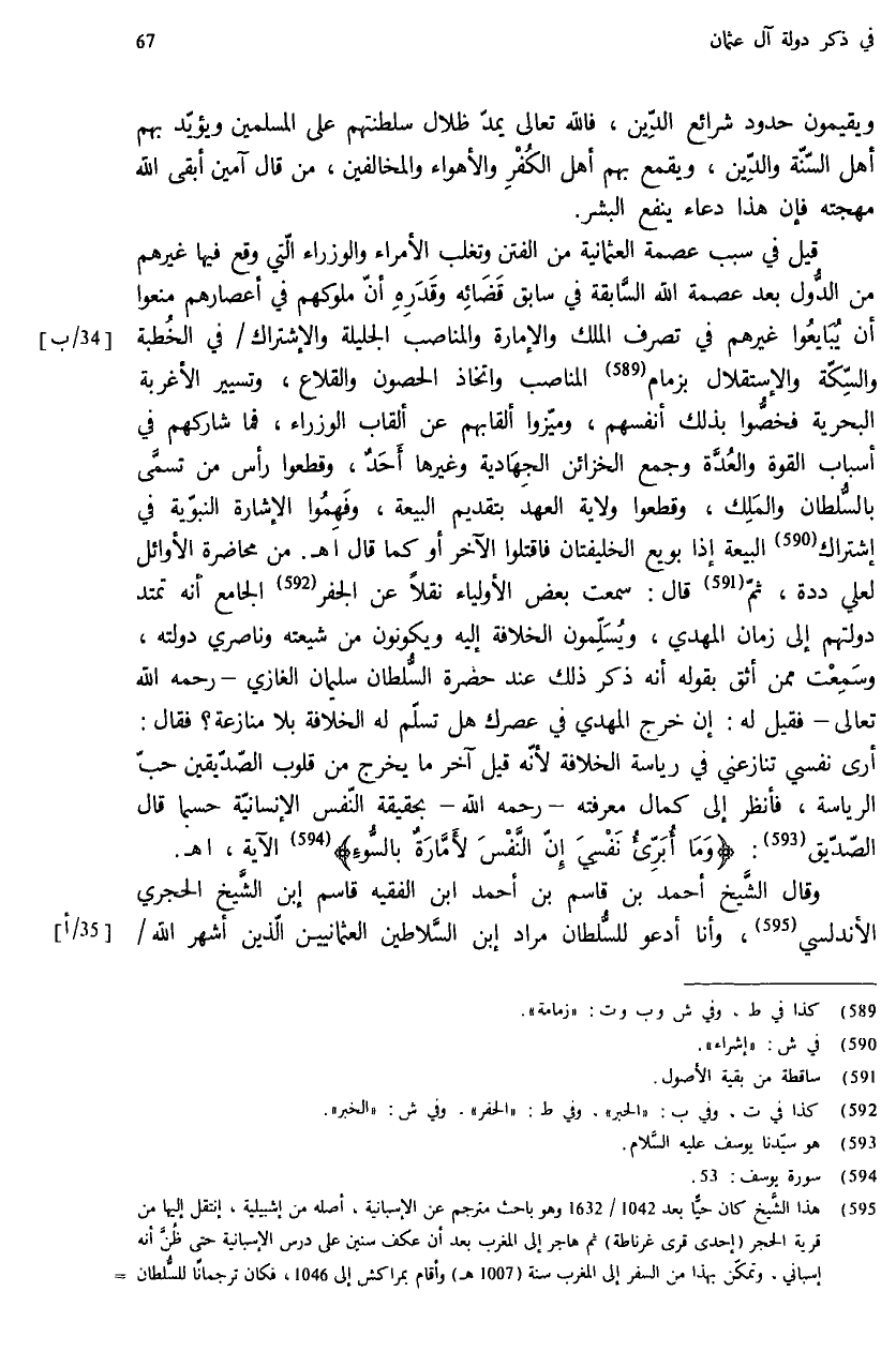 وقال الشّيخ أحمد بن قاسم بن أحمد ابن الفقيه قاسم إبن الشّيخ الحجري الأندلسي (¬595)، وأنا أدعو للسّلطان مراد إبن السّلاطين العثمانيين الّذين أشهر الله /