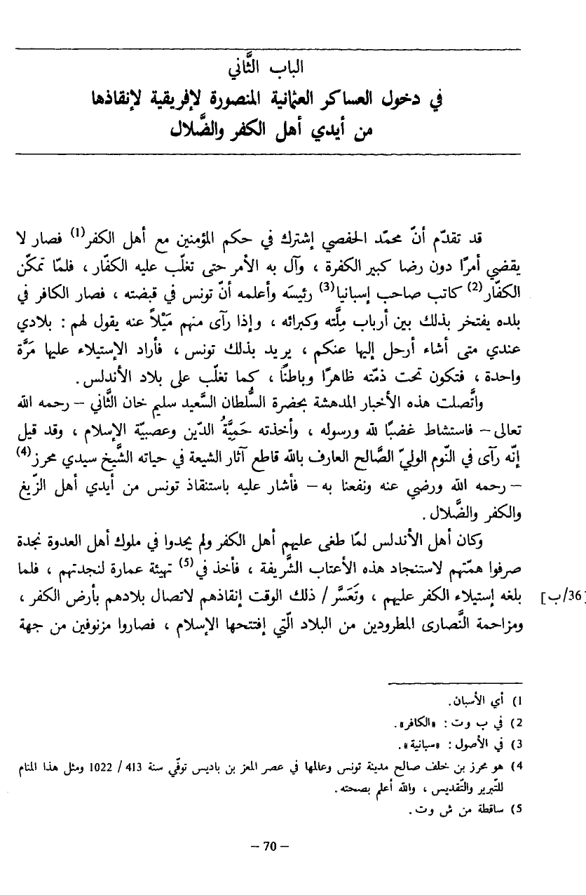قد تقدّم أنّ محمّد الحفصي إشترك في حكم المؤمنين مع أهل الكفر (¬1) فصار لا يقضي أمرا دون رضا كبير الكفرة، وآل به الأمر حتى تغلّب عليه الكفّار، فلمّا تمكّن الكفّار (¬2) كاتب صاحب إسبانيا (¬3) رئيسه وأعلمه أنّ تونس في قبضته، فصار الكافر في بلده يفتخر بذلك بين أرباب ملّته وكبرائه، وإذا رآى منهم ميلا عنه يقول لهم: بلادي عندي متى أشاء أرحل إليها عنكم، يريد بذلك تونس، فأراد الإستيلاء عليها مرّة واحدة، فتكون تحت ذمّته ظاهرا وباطنا، كما تغلّب على بلاد الأندلس.