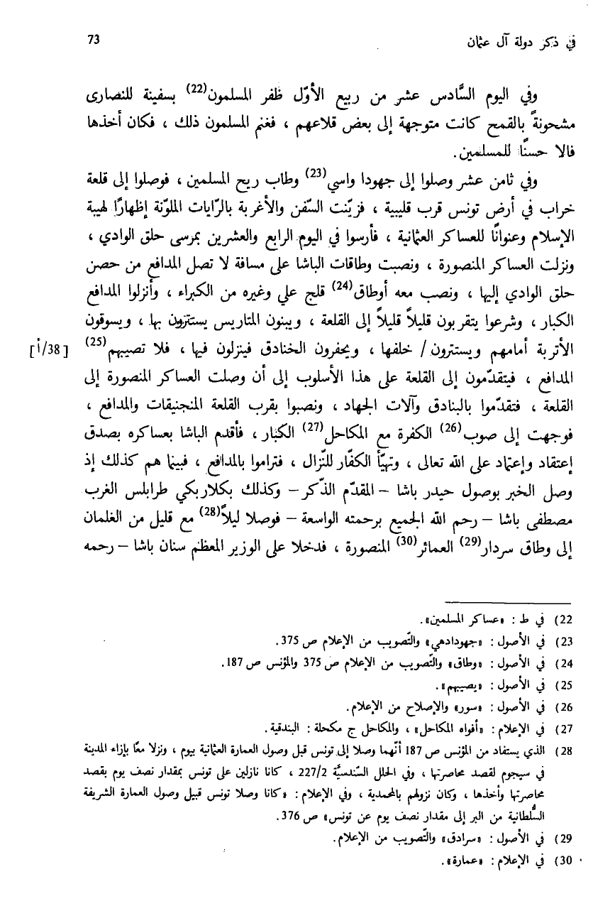 (¬28) الذي يستفاد من المؤنس ص: 187 أنّهما وصلا إلى تونس قبل وصول العمارة العثمانية بيوم، ونزلا معا بإزاء المدينة في سيجوم لقصد محاصرتها، وفي الحلل السّندسيّة 2/ 227، كانا نازلين على تونس بمقدار نصف يوم بقصد محاصرتها وأخذها، وكان نزولهم بالمحمدية، وفي الإعلام: «كانا وصلا تونس قبيل وصول العمارة الشريفة السّلطانية من البر إلى مقدار نصف يوم عن تونس» ص: 376.