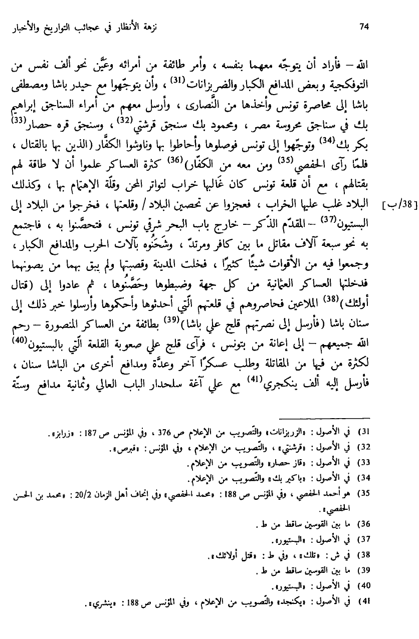 الله - فأراد أن يتوجّه معهما بنفسه، وأمر طائفة من أمرائه وعيّن نحو ألف نفس من التوفكجية وبعض المدافع الكبار والضربزانات (¬31)، وأن يتوجّهوا مع حيدر باشا ومصطفى باشا إلى محاصرة تونس وأخذها من النّصارى، وأرسل معهم من أمراء السناجق إبراهيم بك في سناجق محروسة مصر، ومحمود بك سنجق قرشتي (¬32)، وسنجق قره حصار (¬33) بكر بك (¬34) وتوجّهوا إلى تونس فوصلوها وأحاطوا بها وناوشوا الكفّار (الذين بها بالقتال، فلمّا رآى الحفصي (¬35) ومن معه من الكفّار) (¬36) كثرة العساكر علموا أن لا طاقة لهم بقتالهم، مع أن قلعة تونس كان غالبها خراب لتواتر المحن وقلّة الإهتمام بها، وكذلك البلاد غلب عليها الخراب، فعجزوا عن تحصين البلاد / وقلعتها، فخرجوا من البلاد إلى البستيون (¬37) - المقدّم الذّكر - خارج باب البحر شرقي تونس، فتحصّنوا به، فاجتمع به نحو سبعة آلاف مقاتل ما بين كافر ومرتدّ، وشحنوه بآلات الحرب والمدافع الكبار، وجمعوا فيه من الأقوات شيئا كثيرا، فخلت المدينة وقصبتها ولم يبق بهما من يصونهما فدخلتها العساكر العثمانية من كل جهة وضبطوها وحصّنوها، ثم عادوا إلى (قتال أولئك) (¬38) الملاعين فحاصروهم في قلعتهم الّتي أحدثوها وأحكموها وأرسلوا خبر ذلك إلى سنان باشا (فأرسل إلى نصرتهم قلج علي باشا) (¬39) بطائفة من العساكر المنصورة - رحم الله جميعهم - إلى إعانة من بتونس، فرآى قلج علي صعوبة القلعة الّتي بالبستيون (¬40) لكثرة من فيها من المقاتلة وطلب عسكرا آخر وعدّة ومدافع أخرى من الباشا سنان، فأرسل إليه ألف ينكجري (¬41) مع علي آغة سلحدار الباب العالي وثمانية مدافع وستّة