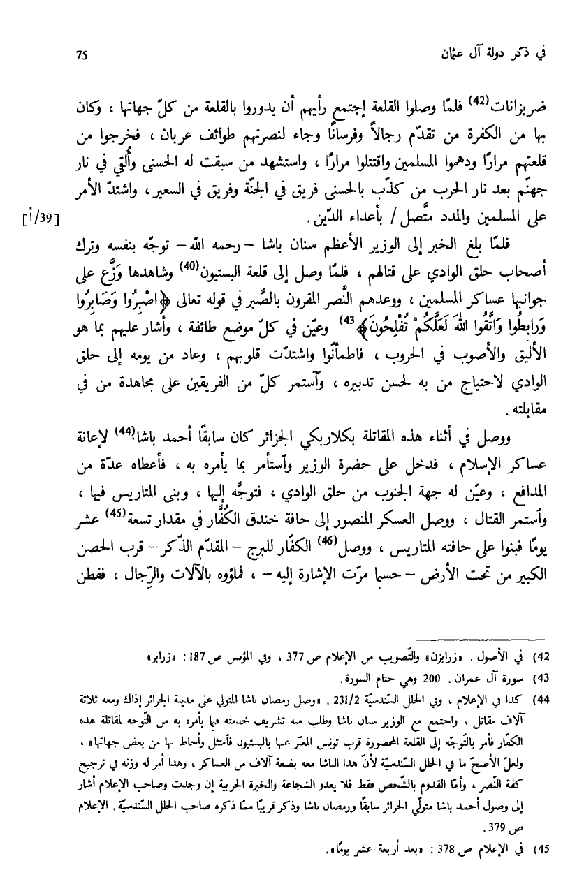 (¬44) كذا في الإعلام، وفي الحلل السّندسيّة 2/ 231: «وصل رمضان باشا المتولي على مدينة الجزائر إذاك ومعه ثلاثة آلاف مقاتل، واجتمع مع الوزير سنان باشا وطلب منه تشريف خدمته فيما يأمره به من التّوجه لمقاتلة هذه الكفّار فأمر بالتّوجّه إلى القلعة المحصورة قرب تونس المعبّر عنها بالبستيون فامتثل وأحاط بها من بعض جهاتها»، ولعلّ الأصحّ ما في الحلل السّندسيّة لأنّ هذا الباشا معه بضعة آلاف من العساكر، وهذا أمر له وزنه في ترجيح كفة النّصر، وأمّا القدوم بالشّخص فقط فلا يعدو الشجاعة والخبرة الحربية إن وجدت وصاحب الإعلام أشار إلى وصول أحمد باشا متولّي الجزائر سابقا ورمضان باشا وذكر قريبا ممّا ذكره صاحب الحلل السّندسيّة. الإعلام ص: 379.