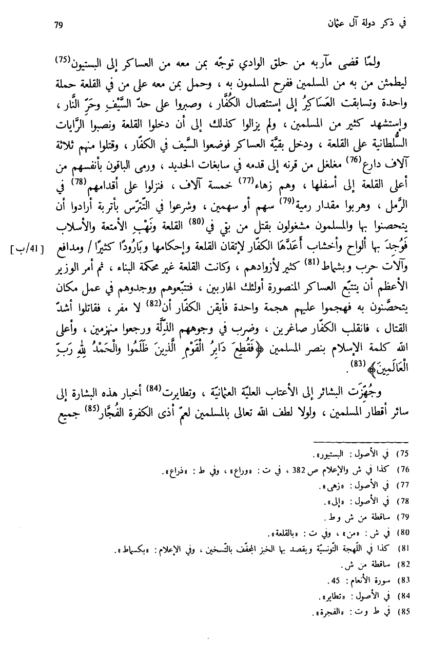 ولمّا قضى مآربه من حلق الوادي توجّه بمن معه من العساكر إلى البستيون (¬75) ليطمئن من به من المسلمين ففرح المسلمون به، وحمل بمن معه على من في القلعة حملة واحدة وتسابقت العساكر إلى إستئصال الكفّار، وصبروا على حدّ السّيف وحرّ النّار، وإستشهد كثير من المسلمين، ولم يزالوا كذلك إلى أن دخلوا القلعة ونصبوا الرّايات السّلطانية على القلعة، ودخل بقيّة العساكر فوضعوا السّيف في الكفّار، وقتلوا منهم ثلاثة آلاف دارع (¬76) مغلغل من قرنه إلى قدمه في سابغات الحديد، ورمى الباقون بأنفسهم من أعلى القلعة إلى أسفلها، وهم زهاء (¬77) خمسة آلاف، فنزلوا على أقدامهم (¬78) في الرّمل، وهربوا مقدار رمية (¬79) سهم أو سهمين، وشرعوا في التّترّس بأتربة أرادوا أن يتحصنوا بها والمسلمون مشغولون بقتل من بقي في (¬80) القلعة ونهب الأمتعة والأسلاب فوجد بها ألواح وأخشاب أعدّها الكفّار لإتقان القلعة وإحكامها وبارودا كثيرا / ومدافع وآلات حرب وبشماط (¬81) كثير لأزوادهم، وكانت القلعة غير محكمة البناء، ثم أمر الوزير الأعظم أن يتتبّع العساكر المنصورة أولئك الهاربين، فتتبّعوهم ووجدوهم في عمل مكان يتحصّنون به فهجموا عليهم هجمة واحدة فأيقن الكفّار أن (¬82) لا مفر، فقاتلوا أشدّ القتال، فانقلب الكفّار صاغرين، وضرب في وجوههم الذّلّة ورجعوا منهزمين، وأعلى الله كلمة الإسلام بنصر المسلمين {فَقُطِعَ دابِرُ الْقَوْمِ الَّذِينَ ظَلَمُوا وَالْحَمْدُ لِلّهِ رَبِّ الْعالَمِينَ} (¬83).