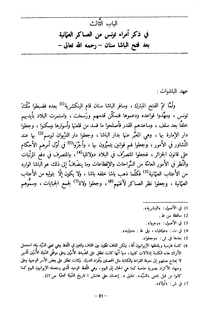 (¬6) كلمة فارسية ويلفظها الإيرانيون آقا، ولكن القاف تكون بين القاف والغين في اللّفظ وهي تعني السّيّد وقد استعمل الأتراك هذه الكلمة لدلالات كثيرة، منها أنّها كانت تطلق على الضّباط الأميّين وعلى موظّفي الدّولة الأميّين الّذين لا يحتاج عملهم إلى معرفة للقراءة والكتابة مثل المحصلين وأفراد الدرك. وكانت تطلق على بعض الأسر الوجيهة وعلى وجهاء الأكراد بصورة خاصة كما هي الحال إلى اليوم، وهي اللّفظ الوحيد الّذي يستعمله الإيرانيون اليوم كما كانوا من قبل بمعنى «السّيّد». تعليق د. إحسان حقي هامش 1 تاريخ الدّولة العليّة ص: 177.