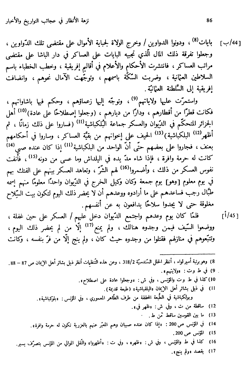 واستمرّت عليها ولاياتهم (¬9)، وتوجّه إليها زعماؤهم، وحكم فيها باشاواتهم، فكانت قطرا من أقطارهم، ودارا من ديارهم، (وجعلوا إصطلاحا على عادة) (¬10) أهل الجزائر المتحكّم في الدّيوان والعسكر جماعة البلكباشية (¬11) (فساروا على ذلك زمانا، ثم أظهر (¬12) البلكباشية) (¬13) الحيف على إخوانهم من بقيّة العساكر، وساروا في أحكامهم بعنف، فجاروا على بعضهم حتّى أنّ الواحد من البلكباشية (11) إذا كان عنده صبي (¬14) كانت له حرمة وافرة، فإذا شاء مدّ يده في اليلداش وما عسى من دونه (¬15)، فأنفت نفوس العسكر من ذلك، وأضمروا (¬16) لهم الشّرّ، وتعاهد العسكر بينهم على الفتك بهم في يوم معلوم [وهو] يوم جمعة وكان وكيل الخرج في الدّيوان واحدا معلوما منهم إسمه طبّال رجب فساعدهم على ما أرادوه ووعدهم أن لا يحضر ذلك اليوم لتكون بيت السّلاح مغلوقة حتى لا يجدوا سلاحا يدافعون به عن أنفسهم.