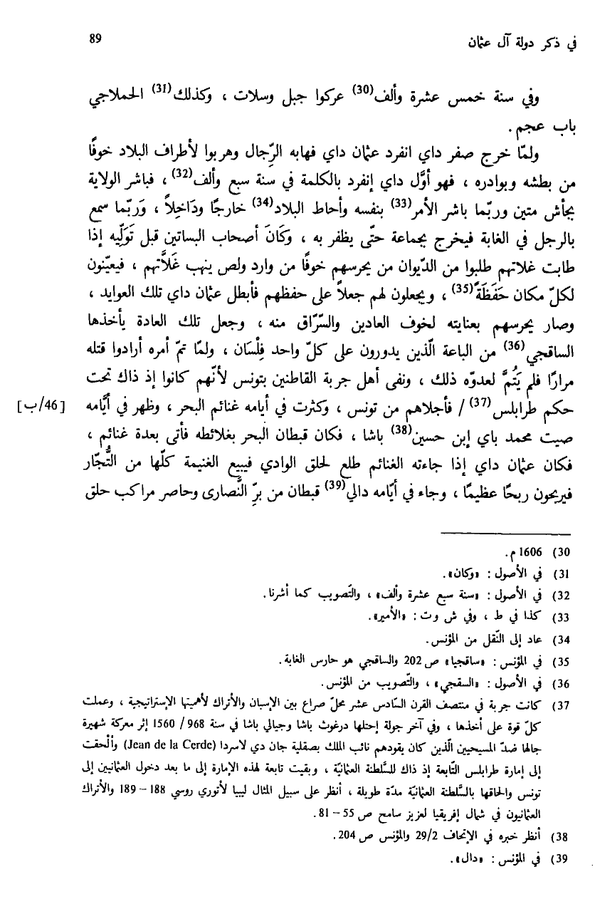 (¬37) كانت جربة في منتصف القرن السّادس عشر محلّ صراع بين الإسبان والأتراك لأهميتها الإستراتيجية، وعملت كلّ قوة على أخذها، وفي آخر جولة إحتلها درغوث باشا وجيالي باشا في سنة 968/ 1560 إثر معركة شهيرة جالها ضدّ المسيحيين الّذين كان يقودهم نائب الملك بصقلية جان دي لاسردا (Jean de la Cerde) وألحقت إلى إمارة طرابلس التّابعة إذ ذاك للسّلطنة العثمانيّة، وبقيت تابعة لهذه الإمارة إلى ما بعد دخول العثمانيين إلى تونس والحاقها بالسّلطنة العثمانيّة مدّة طويلة، أنظر على سبيل المثال ليبيا لأتوري روسي 188 - 189 والأتراك العثمانيون في شمال إفريقيا لعزيز سامح ص: 55 - 81.