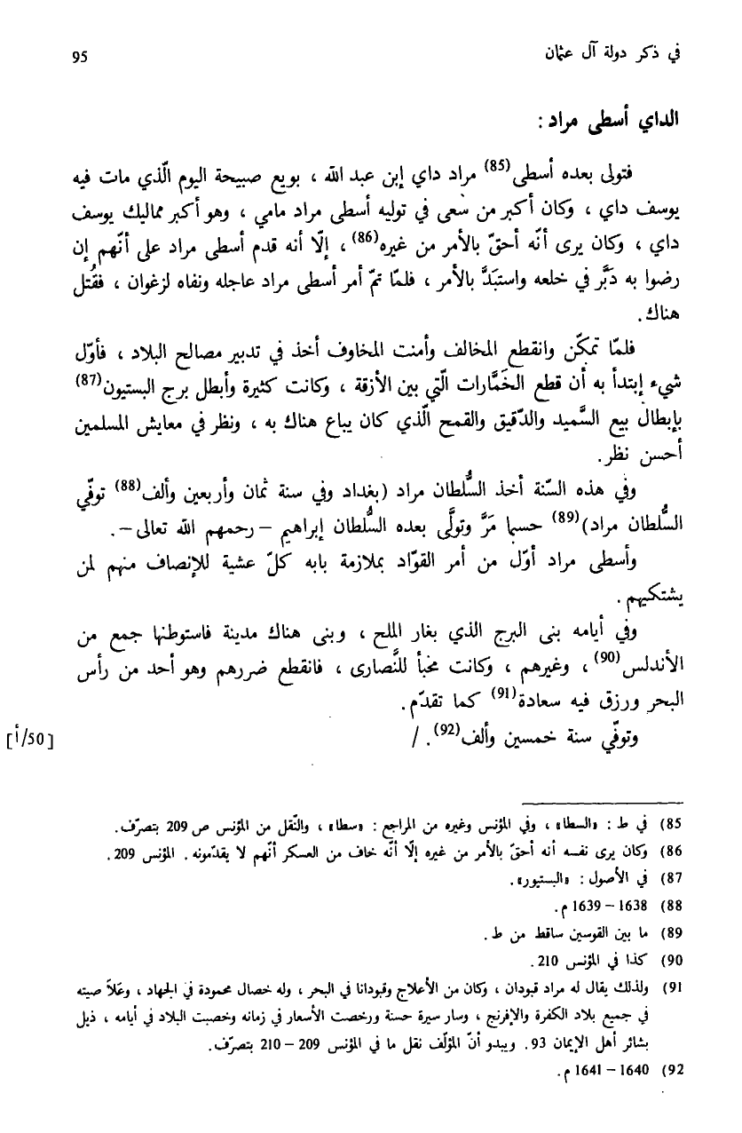 (¬91) ولذلك يقال له مراد قبودان، وكان من الأعلاج وقبودانا في البحر، وله خصال محمودة في الجهاد، وعلا صيته في جميع بلاد الكفرة والإفرنج، وسار سيرة حسنة ورخصت الأسعار في زمانه وخصبت البلاد في أيامه، ذيل بشائر أهل الإيمان 93. ويبدو أنّ المؤلّف نقل ما في المؤنس 209 - 210 بتصرّف.
