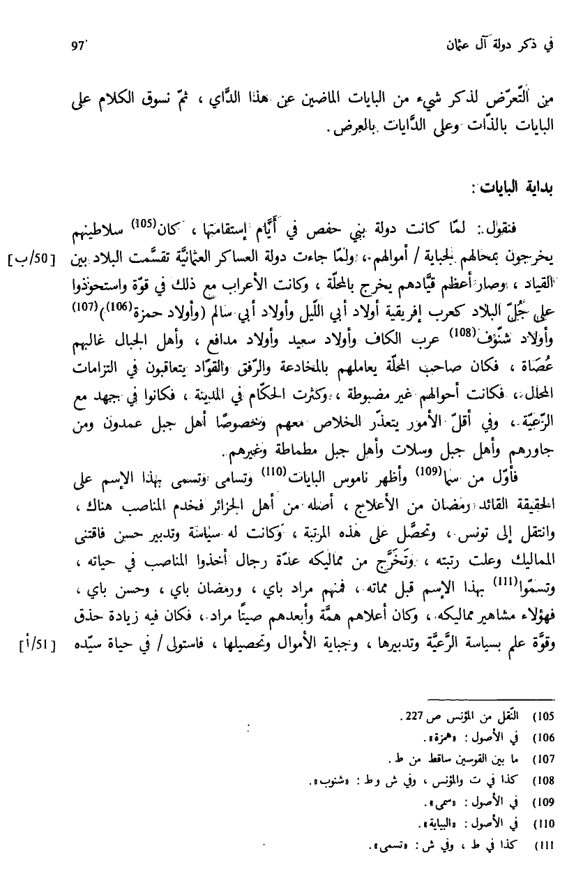 فنقول: لمّا كانت دولة بني حفص في أيّام إستقامتها، كان (¬105) سلاطينهم يخرجون بمحالهم لجباية أموالهم، ولمّا جاءت دولة العساكر العثمانيّة تقسّمت البلاد بين القياد، وصار أعظم قيّادهم يخرج بالمحلّة، وكانت الأعراب مع ذلك في قوّة واستحوذوا على جلّ البلاد كعرب إفريقية أولاد أبي اللّيل وأولاد أبي سالم (وأولاد حمزة (¬106)) (¬107) وأولاد شنّوف (¬108) عرب الكاف وأولاد سعيد وأولاد مدافع، وأهل الجبال غالبهم عصاة، فكان صاحب المحلّة يعاملهم بالمخادعة والرّفق والقوّاد يتعاقبون في التزامات المحال، فكانت أحوالهم غير مضبوطة، وكثرت الحكّام في المدينة، فكانوا في جهد مع الرّعيّة، وفي أقلّ الأمور يتعذّر الخلاص معهم وخصوصا أهل جبل عمدون ومن جاورهم وأهل جبل وسلات وأهل جبل مطماطة وغيرهم.