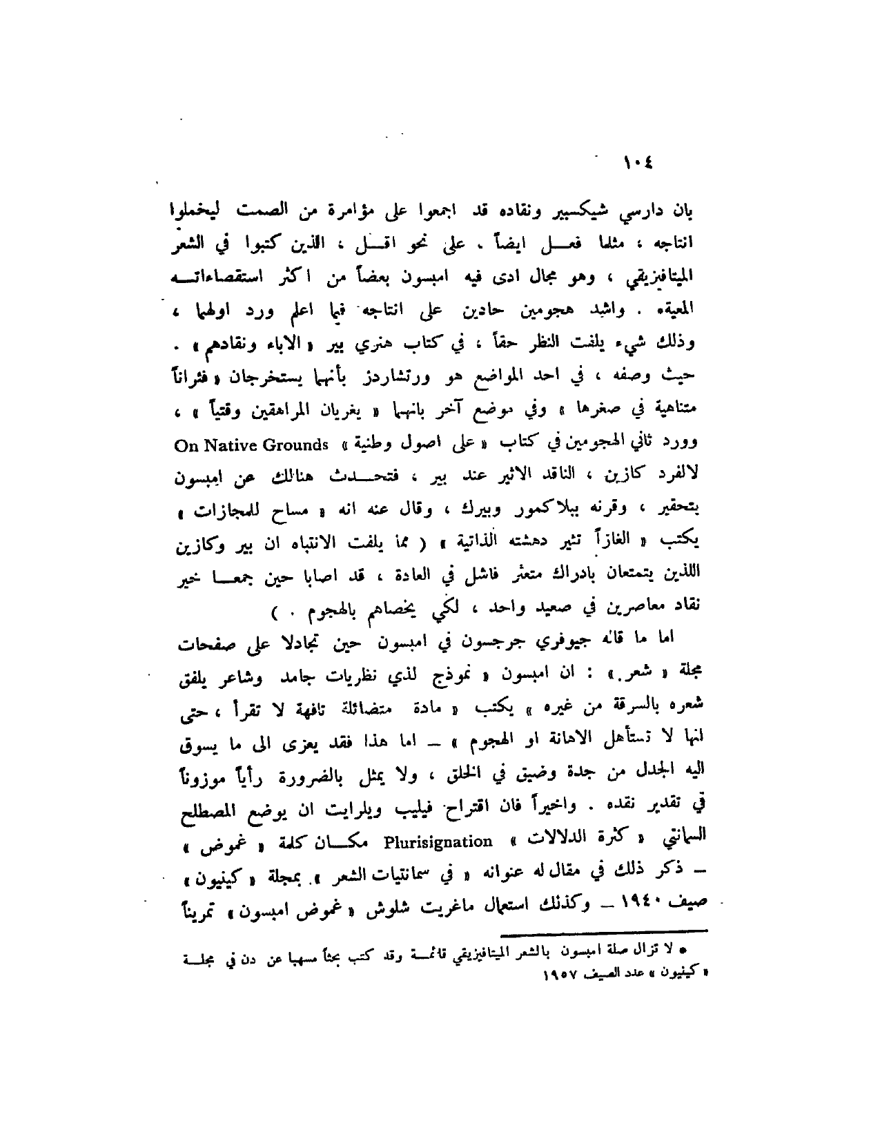 (1) لا تزال صلة إمبسون بالشعر الميتافيزيقي قائمة وقد كتب بحثاً مسهباً عن دن في مجلة " كينيون " عدد الصيف 1957.