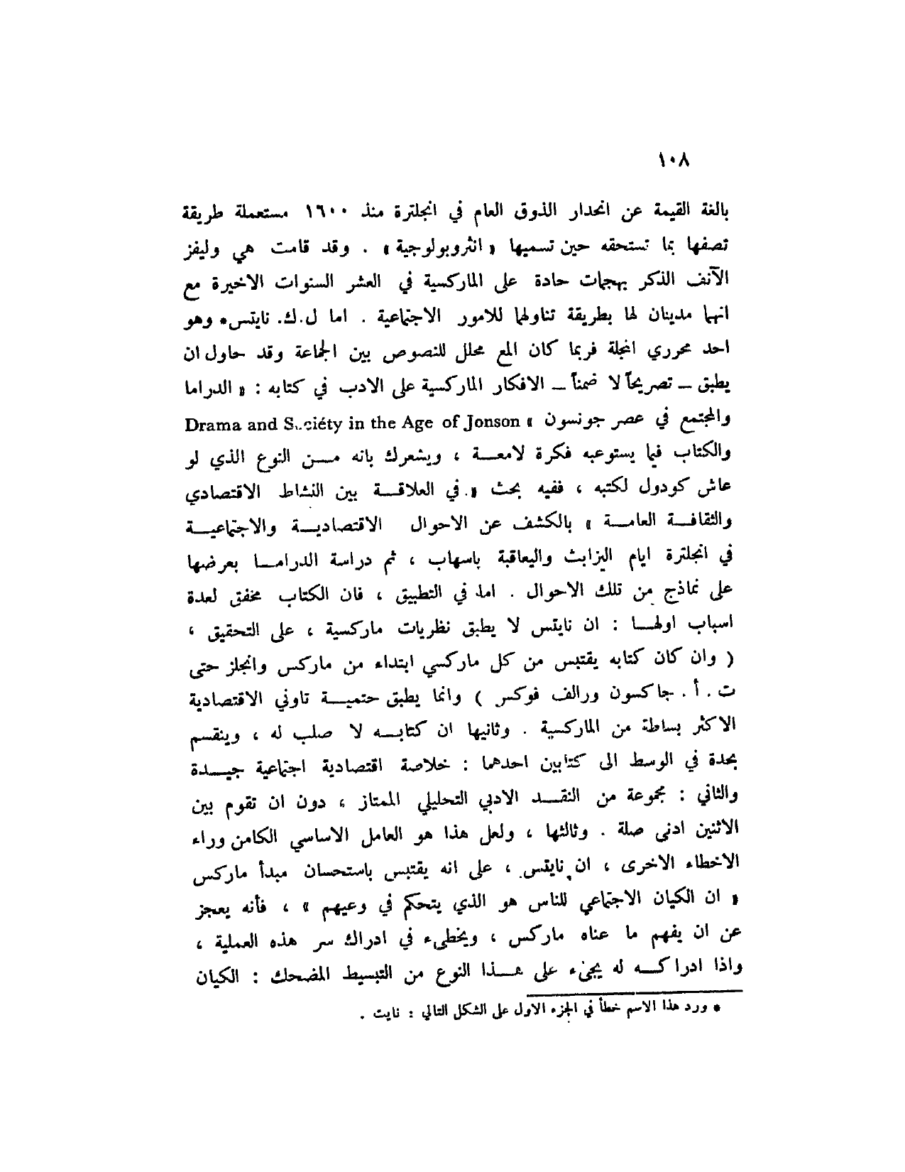 بالغة القيمة عن انحدار الذوق العام في انجلترة منذ 1600 مستعملة طريقة تصفها بما تستحقه حين تسميها " انثروبولوجية ". وقد قامت هي وليفز الآنف الذكر بهجمات حادة على الماركسية في العشر السنوات الأخيرة مع إنهما مدينتان لها بطريقة تناولهما للأمور الاجتماعية. أما ل. ك. نايتس (1) وهو أحد محرري المجلة فربما كان ألمع محلل للنصوص بين الجماعة وقد حاول أن يطبق - تصريحاً لا ضمناً - الأفكار الماركسية على الأدب في كتابه: " الدراما والمجتمع في عصر جونسون " Drama and Society in the Age of Jonson والكتاب فيما يستوعبه فكرة لامعة، ويشعرك بأنه من النوع الذي لو عاش كودول لكتبه، ففيه بحث " في العلاقة بين النشاط الاقتصادي والثقافة العامة " بالكشف عن الأحوال الاقتصادية والاجتماعية في إنجلترة أيام إليزابث واليعاقبة بإسهاب، ثم دراسة الدراما بعرضها على نماذج من تلك الأحوال. أما في التطبيق، فإن الكتاب مخفق لعدة أسباب أولها: إن نايتس لا يطبق نظريات ماركسية، على التحقيق، (وإن كان كتابه يقتبس من كل ماركسي ابتداء من ماركس وإنجلز حتى ت. أز جاكسون ورالف فوكس) وإنما يطبق حتمية تاوني الاقتصادية الأكثر بساطة من الماركسية. وثانيها إن كتابه لا صلب له، وينقسم بحدة في الوسط إلى كتابين أحدهما: خلاصة اقتصادية اجتماعية جيدة والثاني: مجموعة من النقد الأدبي التحليلي الممتاز، دون أن تقوم بين الاثنين أدنى صلة. وثالثها، ولعل هذا هو العامل الأساسي الكامن وراء الأخطاء الاخرى، إن نايتس، على أنه يقتبس باستحسان مبدأ ماركس " إن الكيان الاجتماعي للناس هو الذي يتحكم في وعيهم "، فإنه يعجز عن أن يفهم ما عناه ماركس، ويخطئ في إدراك سر هذه العملية، وإذا إدراكه له يجيء على هذا النوع من التبسيط المضحك: الكيان
