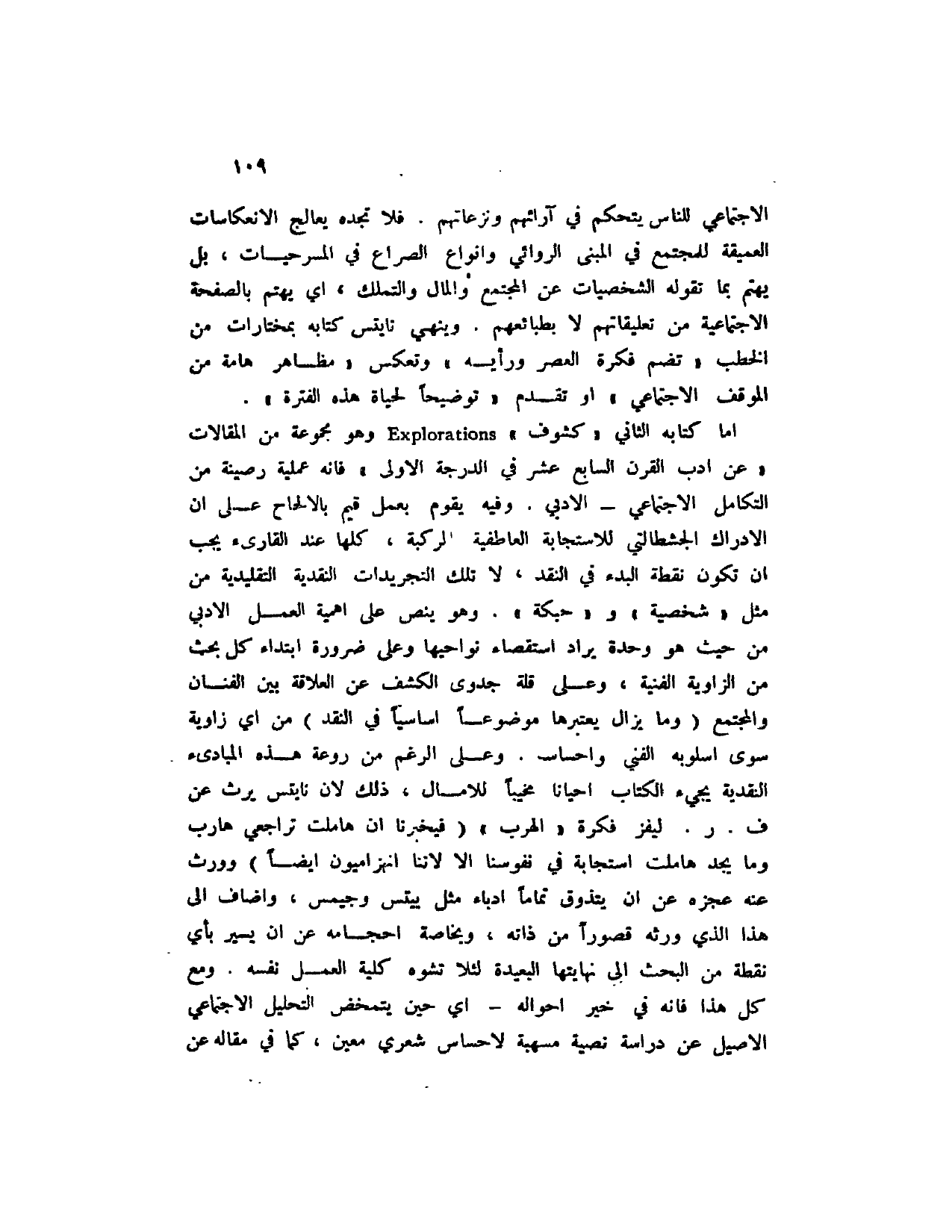 أما كتابه الثاني " كشوف " Explorations وهو مجموعة من المقالات " عن أدب القرن السابع عشر من الدرجة الأولى " فإنه عملية رصينة من التكامل الاجتماعي - الأدبي. وفيه يقوم بعمل قيم بالإلحاح على أن الإدراك الجشطالتي للاستجابة العاطفية المركبة، كلها عند القارئ يجب أن تكون نقطة البدء في النقد، لا تلك التجريدات النقدية التقليدية من مثل " شخصية " و " حبكة ". وهو ينص على أهمية العمل الأدبي من حيث هو وحدة يراد استقصاء نواحيها وعلى ضرورة ابتداء كل بحث من الزاوية الفنية، وعلى قلة جدوى الكشف عن العلاقة بين الفنان والمجتمع (وما يزال يعتبرها موضوعاً أساسياً في النقد) من أي زاوية سوى أسلوبه الفني وإحساسه. وعلى الرغم من روعة هذه المبادئ النقدية يجيء الكتاب أحياناً مخيباً الآمال، ذلك لأن نايتس يرث عن ف. ر. ليفز فكرة " الهرب " (فيخبرنا إن هاملت تراجعي هارب وما يجد هاملت استجابة في نفوسنا إلا لأننا انهزاميون أيضاً) وورث عنه عجزه عن أن يتذوق تماماً أدباء مثل ييتس وجيمس، وأضاف إلى هذا الذي ورثه قصوراً من ذاته، وبخاصة إحجامه عن أن يسير بأي نقطة من البحث إلى نهايتها البعيدة لئلا تشوه كلية العمل نفسه. ومع كل هذا فإنه في خير أحواله - أي حين يتمخض التحليل الاجتماعي الأصيل عن دراسة نصية مسهبة لإحساس شعري معين، كما في مقاله عن