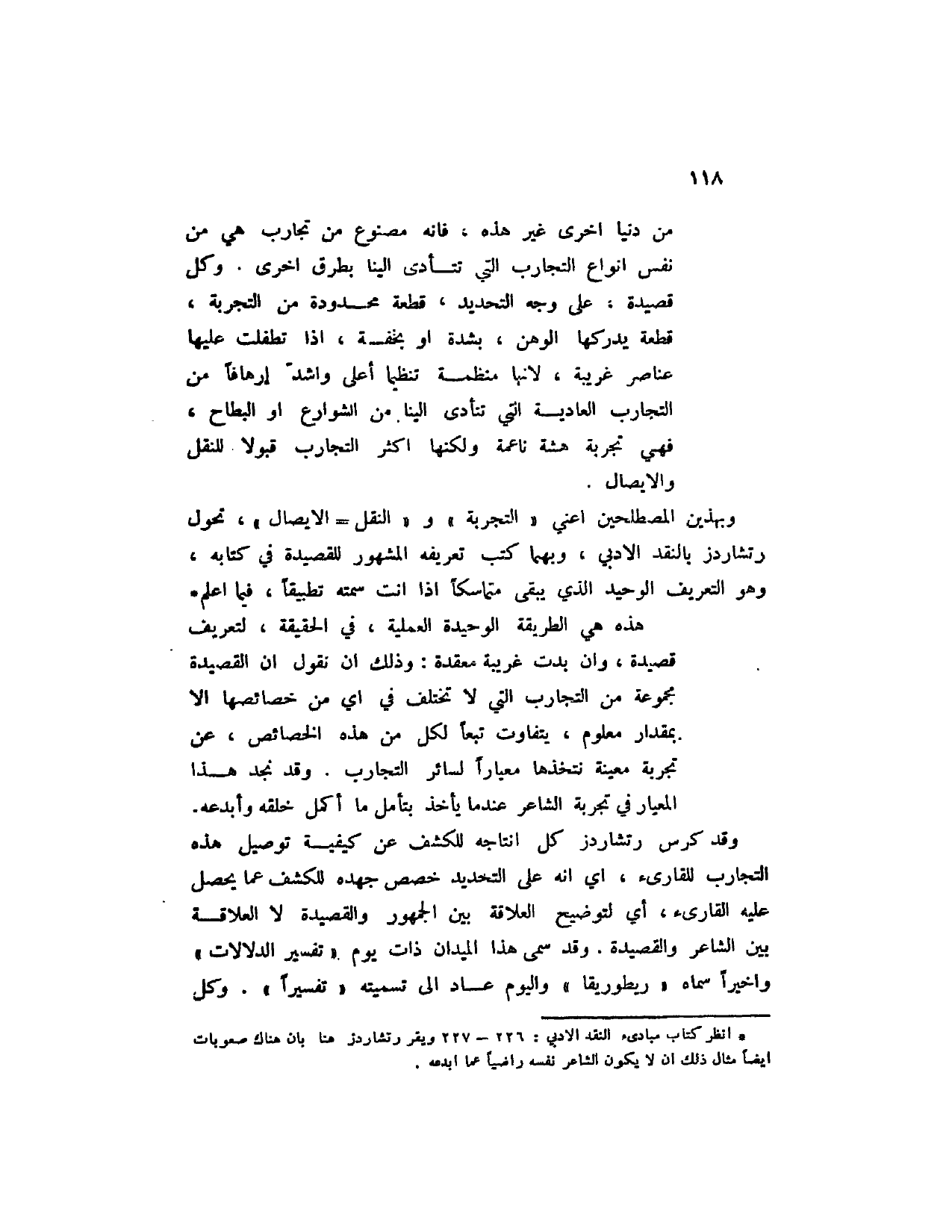 وبهذين المصطلحين اعني " التجربة " و " النقل الإيصال "، تحول رتشاردز بالنقد الادبي، وبهما كتب تعريفه المشهور للقصيدة في كتابه، وهو التعريف الوحيد الذي يبقى متماسكاً إذا أنت سمته تطبيقاً، فيما أعلم (1) .