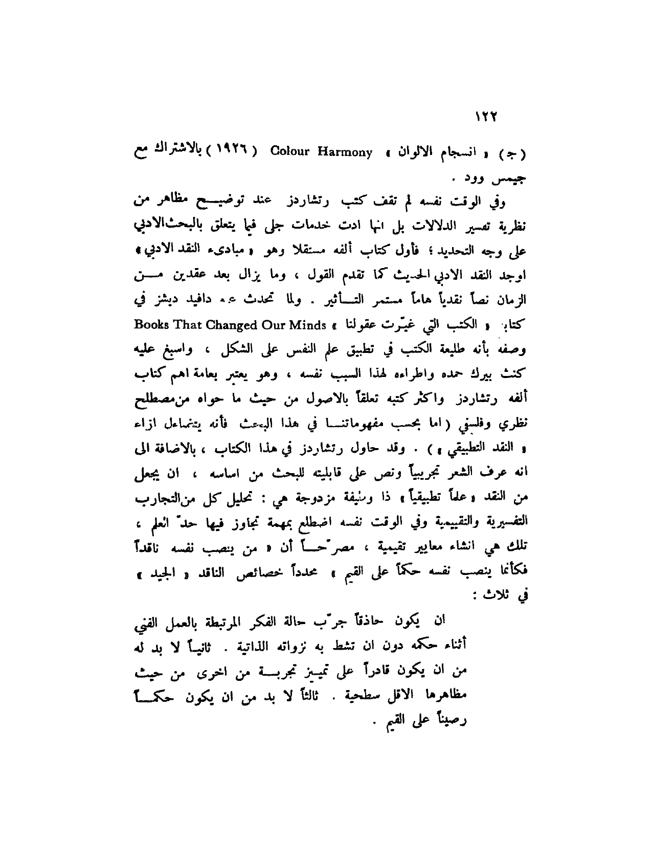 وفي الوقت نفسه لم تقف كتب رتشاردز عند توضيح مظاهر من نظرية تفسير الدلالات بل إنها أدت خدمات جلى فيما يتعلق بالبحث الأدبي على وجه الحديد؛ فأول كتاب ألفه مستقلا وهو " مبادئ النقد الأدبي " أوجد النقد الأدبي الحديث كما تقدم القول، وما يزال بعد عقدين من الزمان نصاً نقدياً هاماً مستمر التأثير. ولما تحدث عنه دافيد ديشز في كتابه " الكتب التي غيرت عقولنا " Books That Changed Our Minds وصفه بأنه طليعة الكتب في تطبيق علم النفس على الشكل، واسبغ عليه كنث بيرك حمده وإطراءه لهذا السبب نفسه، وهو يعتبر بعامة أهم كتاب ألفه رتشاردز وأكثر كتبه تعلقاً بالأصول من حيث ما حواه من مصطلح نظري وفلسفي (أما بحسب مفهوماتنا في هذا البحث فأنه يتضاءل إزاء " النقد التطبيق ") . وقد حاول رتشاردز في هذا الكتاب، بالإضافة إلى أنه عرف الشعر تجريبياً ونص على قابليته للبحث من أساسه، أن يجعل من النقد " علماً تطبيقياً " ذا وظيفة مزدوجة هي: تحليل كل من التجارب التفسيرية والتقييمية وفي الوقت نفسه اضطلع بمهمة تجاوز فيها حد العلم، تلك هي إنشاء معايير تقيمية، مصرحاً أن " من ينصب نفسه ناقداً فكأنما ينصب نفسه حكماً على القيم " محدداً خصائص الناقد " الجيد " في ثلاث: