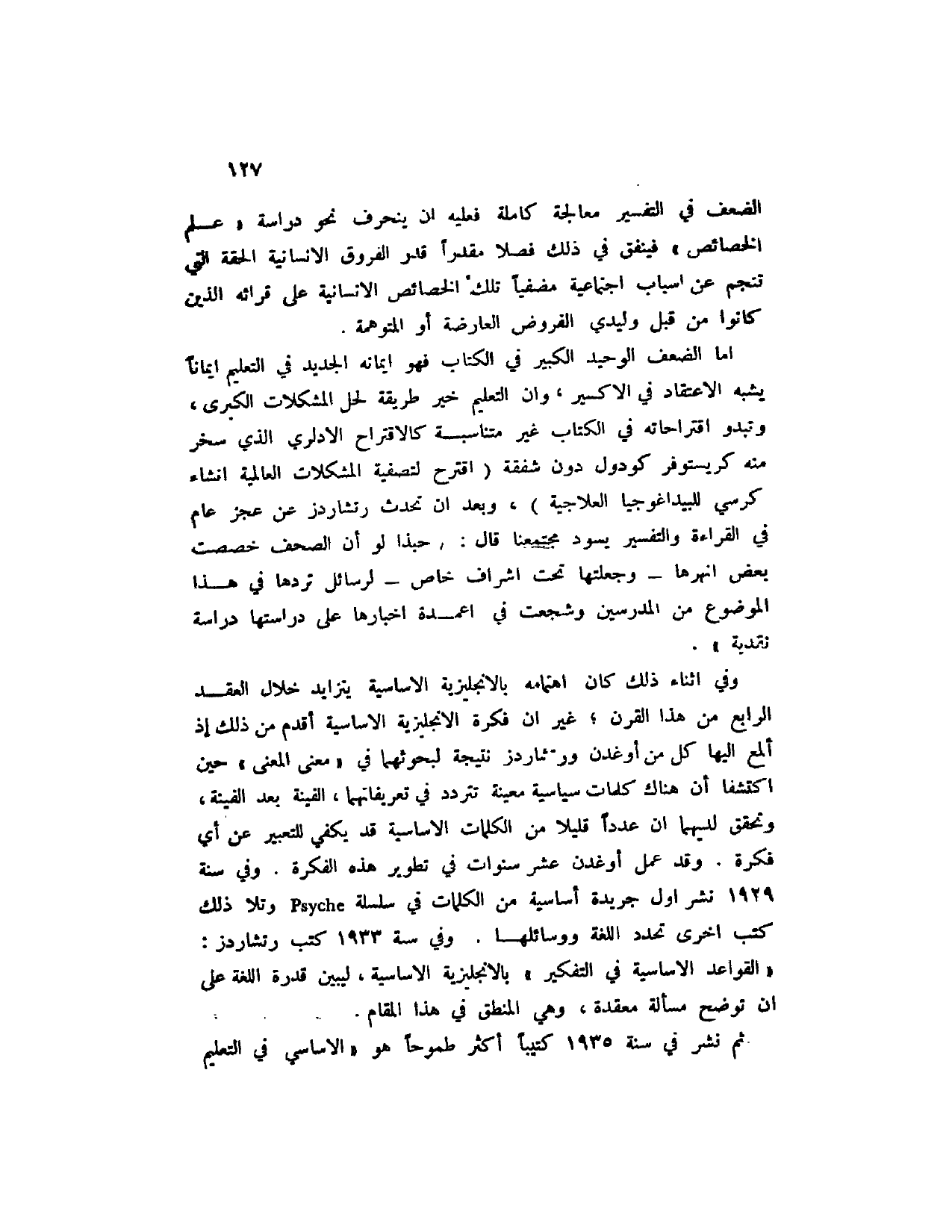أما الضعف الوحيد الكبير في الكتاب فهو إيمانه الجديد في التعليم أيمانا يشبه الاعتقاد في الإكسير، وأن التعليم خير طريقة لحل المشكلات الكبرى، وتبدو اقتراحاته في الكتاب غير متناسبة كالاقتراح الأدلري الذي سخر منه كريستوفر كودول دون شفقة (اقترح لتصفية المشكلات العالمية إنشاء كرسي للبيداغوجيا العلاجية "، وبعد ان تحدث رتشاردز عن عجز عام في القراءة والتفسير يسود مجتمعنا قال: " حبذا لو أن الصحف خصصت بعض انهرها - وجعلتها تحت إشراف خاص - لرسائل تردها في هذا الموضوع من المدرسين وشجعت في أعمدة أخبارها على دراستها دراسة نقدية ".