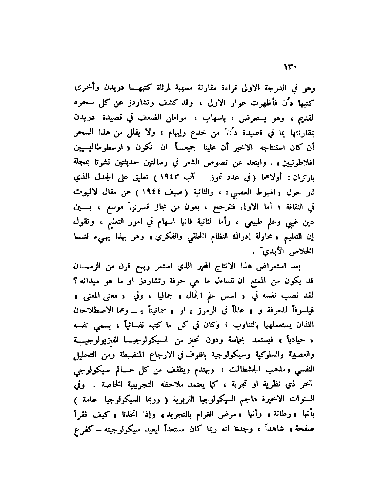 وهو في الدرجة الأولى قراءة مقارنة مسهبة لمرثاة كتبها دريدن وأخرى كتبها دن فأظهرت عوار الأولى، وقد كشف رتشاردز عن كل سحره القديم، وهو يستعرض، باسهاب، مواطن الضعف في قصيدة دريدين بمقارنتها بما في قصيدة دن من خدع وإبهام، ولا يقلل من هذا السحر أن كان استنتاجه الأخير أن علينا جميعاً ان نكون " ارسطوطاليسيين افلاطونيين ". وابتعد عن نصوص الشعر في رسالتين حديثتين نشرتا بمجلة بارتزان: أولاهما (في عدد تموز - آب 1943) تعليق على الجدل الذي ثار حول " الهبوط العصبي "، والثانية (صيف 1944) عن مقال لاليوت في الثقافة؛ أما الأولى فتترجح، بعون من مجاز قسري موسع، بين دين غيبي وعلم طبيعي، وأما الثانية فأنها إسهام في أمور التعليم، وتقول إن التعليم " محاولة إدراك النظام الخلقي والفكري " وهو بهذا يهيئ لنا الخلاص الأبدي.