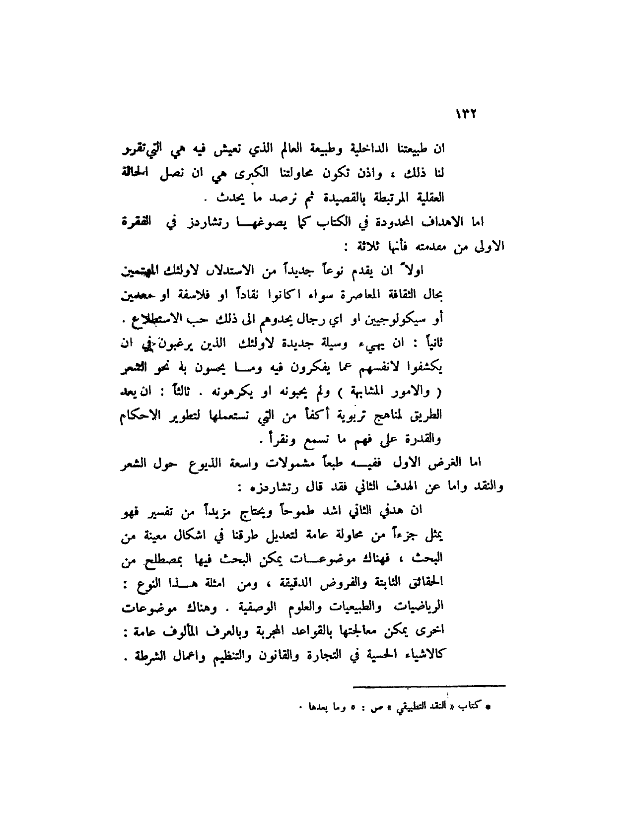 أما الغرض الأول ففيه طبعاً مشمولات واسعة الذيوع حول الشعر والنقد وأما عن الهدف الثاني فقد قال رتشاردز (1) :