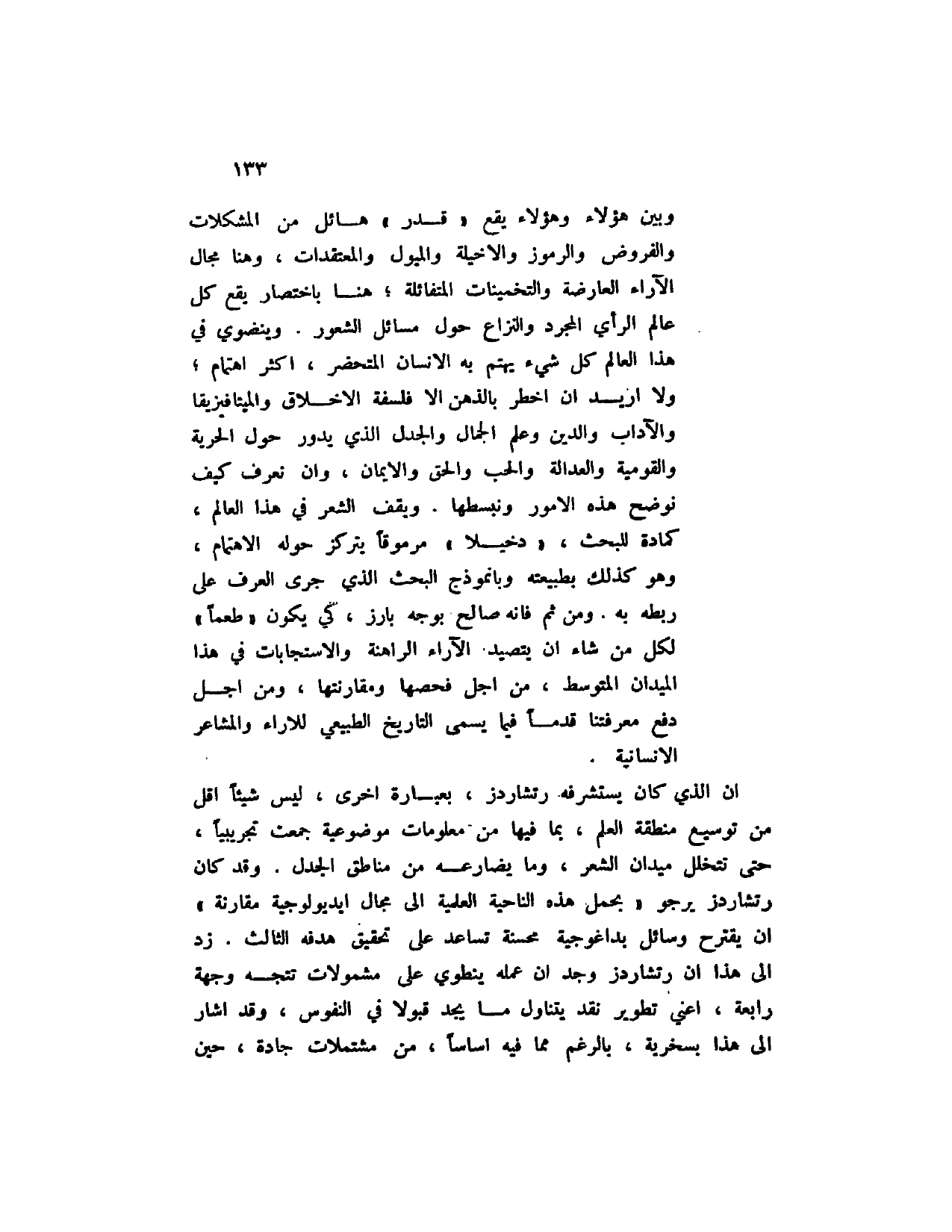 وبين هؤلاء وهؤلاء يقع " قدر " هائل " من المشكلات والفروض والرموز والأخيلة والميول والمعتقدات، وهنا مجال الآراء العارضة والتخمينات المتفائلة؛ هنا باختصار يقع كل عالم الرأي المجرد والنزاع حول مسائل الشعور. وينضوي في هذا العالم كل شيء يهتم به الإنسان المتحضر، أكثر اهتمام؛ ولا أريد ان اخطر بالذهن إلا فلسفة الأخلاق والميتافيزيقا والآداب والدين وعلم الجمال والجدل الذي يدور حول الحرية والقومية والعدالة والحب والحق والايمان، وان نعرف كيف نوضح هذه الأمور ونبسطها. ويقف الشعر في هذا العالم، كمادة للبحث، " دخيلا " مرموقاً يتركز حوله الاهتمام، وهو كذلك بطبيعته وبأنموذج البحث الذي جرى العرف على ربطه به. ومن ثم فانه صالح بوجه بارز، كي يكون " طعماً " لكل من شاء أن يتصيد الآراء الراهنة والاستجابات في هذا الميدان المتوسط، من أجل فحصها ومقارنتها، ومن أجل دفع معرفتنا قدماً فيما يسمى التاريخ الطبيعي للآراء والمشاعر الإنسانية.