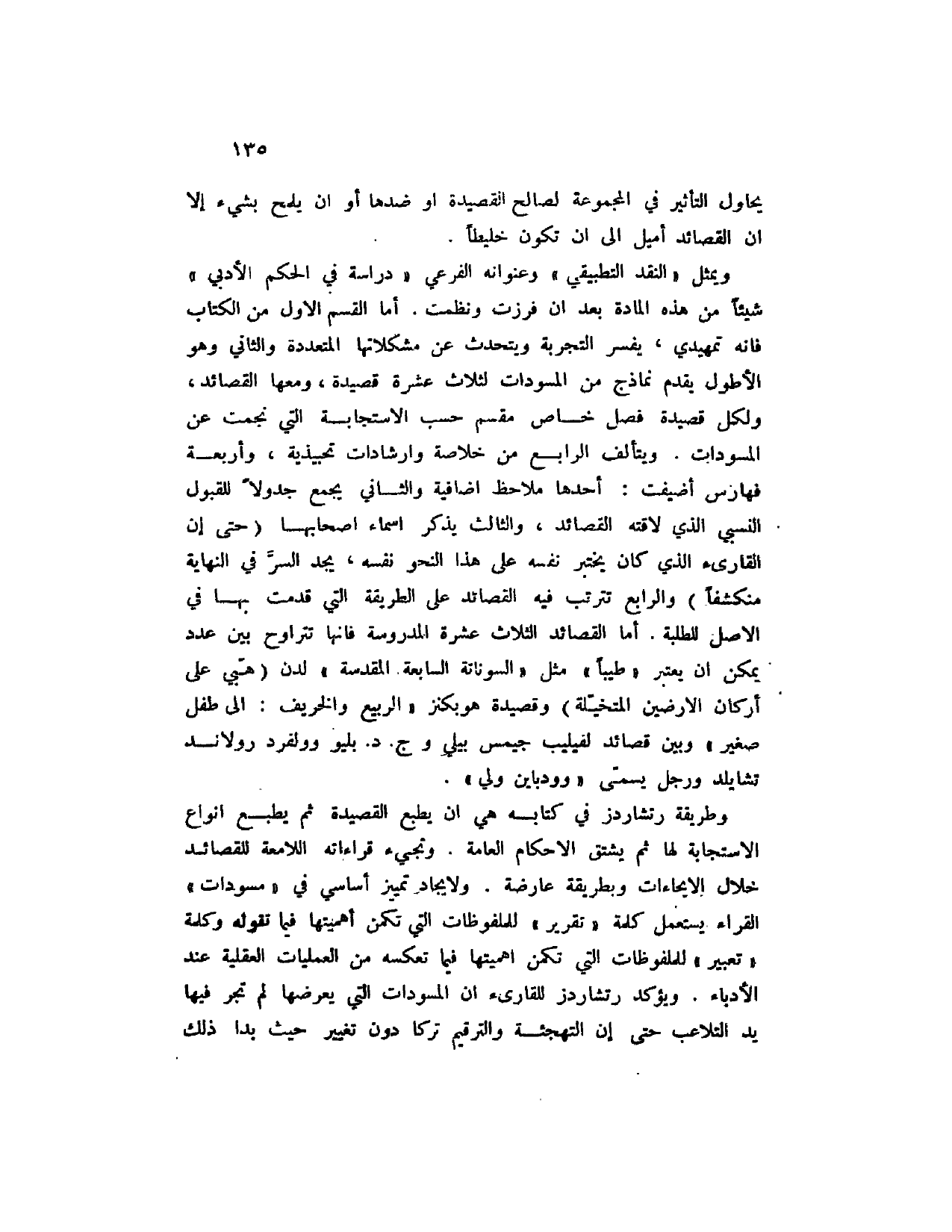 ويمثل " النقد التطبيقي " وعنوانه الفرعي " دراسة في الحكم الأدبي " شيئاً من هذه المادة بعد أن فرزت ونظمت. أما القسم الأول من الكتاب فانه تمهيدي، يفسر التجربة ويتحدث عن مشكلاتها المتعددة والثاني وهو الأطول يقدم نماذج من المسودات لثلاث عشرة قصيدة، ومعها القصائد، ولكل قصيدة فصل خاص مقسم حسب الاستجابة التي نجمت عن المسودات. ويتألف الرابع من خلاصة وإرشادات تحبيذية، وأربعة فهارس أضيفت: أحدها ملاحظ إضافية والثاني يجمع جدولاً للقبول النسبي الذي لاقته القصائد، والثالث يذكر أسماء أصحابها (حتى أن القارئ الذي كان يختبر نفسه على هذا النحو نفسه، يجد السر في النهاية منكشفاً) والرابع تترتب فيه القصائد على الطريقة التي قدمت بها في الأصل للطلبة. أما القصائد الثلاث عشرة المدروسة فإنها تتراوح بين عدد يمكن ان تعتبر " طيباً " مثل " السوناتة السابعة المقدسة " لدن (هبي على أركان الارضين المتخيلة) وقصيدة هوبكنز " الربيع والخريف: إلى طفل صغير " وبين قصائد لفيليب جيمس بيلي وج. د. بليو وولفرد رولاند تشايلد ورجل يسمى " وودباين ولي ".