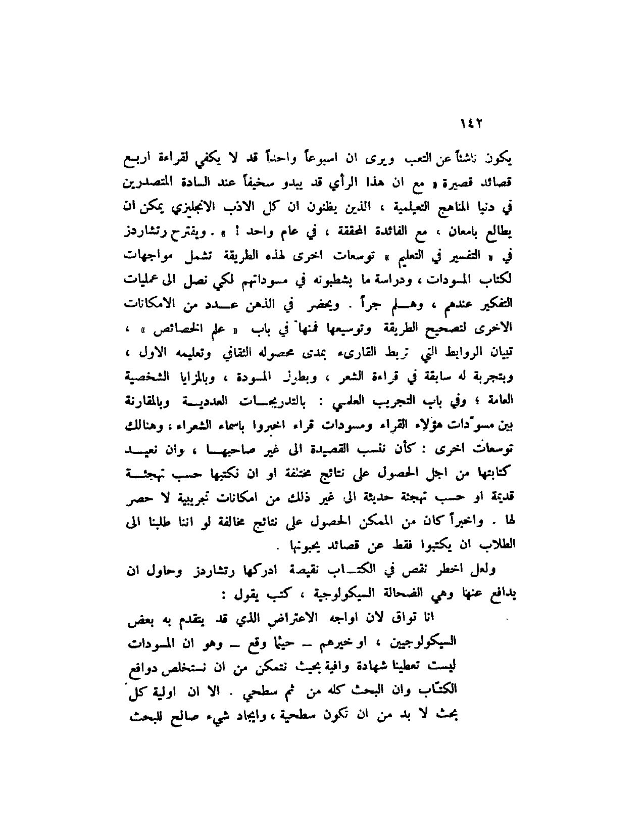 يكون ناشئاً عن التعب ويرى أن أسبوعاً واحداً قد لا يكفي لقراءة أربع قصائد قصيرة " مع أن هذا الرأي قد يبدو سخيفاً عند السادة المتصدرين في دنيا المناهج التعليمية، الذين يظنون أن كل الأدب الإنجليزي يمكن أن يطالع بإمعان، مع الفائدة المحققة، في عالم واحد! ". ويقترح رتشاردز في (التفسير في التعليم " توسعات أخرى لهذه الطريقة تشمل مواجهات لكتاب المسودات، ودراسة ما يسطبونه في مسوداتهم لكي نصل إلى عمليات التفكير عندهم، وهلم جراً. ويحضر في الذهن عدد من الإمكانات الأخرى لتصحيح الطريقة وتوسيعها فمنها في باب " علم الخصائص "، تبيان الروابط التي تربط القارئ بمدى محصوله الثقافي وتعليمه الأول، وبتجربة له سابقة في قراءة الشعر، وبطول المسودة، وبالمزايا الشخصية العامة؛ وفي باب التجريب العلمي: بالتدريجات العددية وبالمقارنة بين مسودات هؤلاء القراء ومسودات قراء اخبروا بأسماء الشعراء، وهنالك كتابتها من أجل الحصول على نتائج مختلفة أو أن نكتبها حسب تهجئة قديمة أو حسب تهجئة حديثة إلى غير ذلك من إمكانات تجريبية لا حصر لها. وأخيراً كان من الممكن الحصول على نتائج مخالفة لو أننا طلبنا إلى الطلاب أن يكتبوا فقط عن قصائد يحبونها.