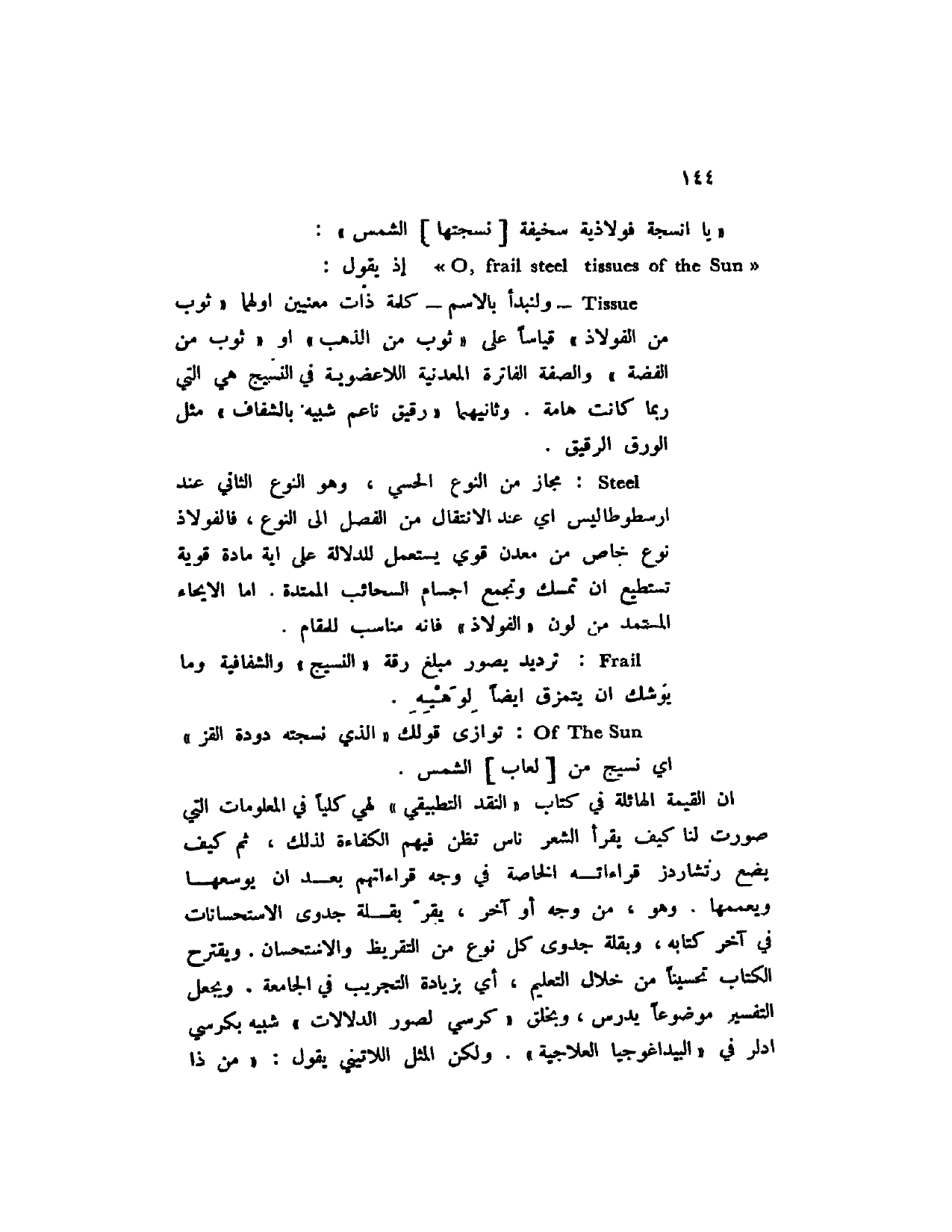 ان القيمة الهائلة في كتاب " النقد التطبيقي " لهي كلياً في المعلومات التي صورت لنا كيف يقرأ الشعر ناس تظن فيهم الكفاءة لذلك، ثم كيف يضع رتشاردز قراءاته الخاصة في وجه قراءاتهم بعد أن يوسعها ويعممها. وهو، من وجه أو آخر، يقر بقلة جدوى الاستحسانات في آخر كتابه، وقلة جدوى كل نوع من التقريظ والاستحسان. ويقترح الكتاب تحسيناً من خلال التعليم، أي بزيارة التجريب في الجامعة. ويجعل التفسير موضوعا يدرس، وبخلق " كرسي لصور الدلالات " شبيه بكرسي أدلر في " البيداغوجيا العلاجية ". ولكن المثل اللاتيني يقول: " من ذا