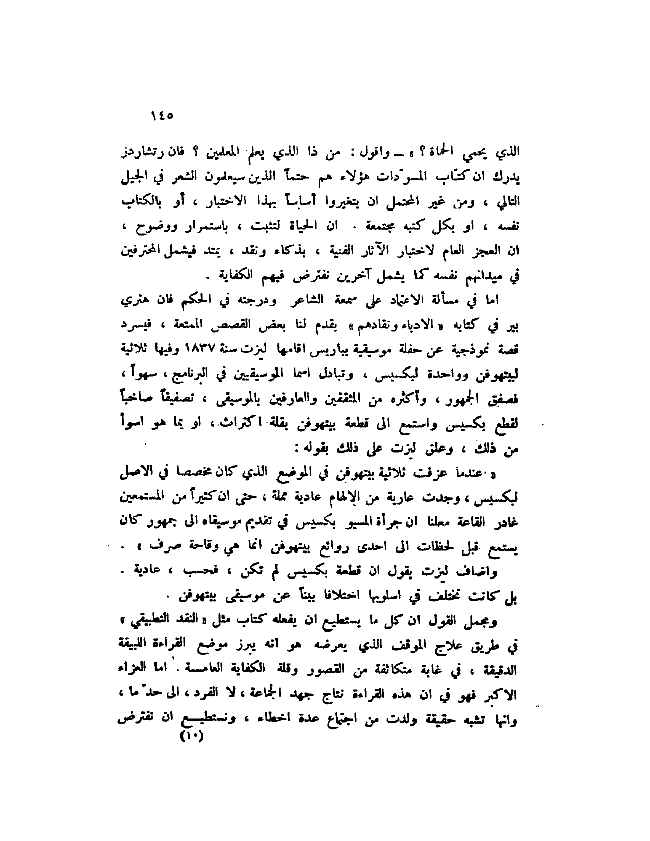أما في مسالة الاعتماد على سمعة الشاعر ودرجته في الحكم فان هنري بير في كتابه " الأدباء ونقادهم " يقدم لنا بعض القصص الممتعة، فيسرد قصة نموذجية عن حفلة موسيقية بباريس أقامها ليزت سنة 1837 وفيها ثلاثية لبيتهوفن وواحدة لبكسيس، وتبادل اسما الموسيقيين في البرنامج، سهواً فصفق الجمهور، وأكثره من المثقفين والعارفين بالموسيقى، تصفيقاً صاخباً لقطع بكسيس واستمع إلى قطعة بيتهوفن بقلة اكتراث، أو بما هو أسوأ من ذلك، وعلق ليزت على ذلك بقوله: