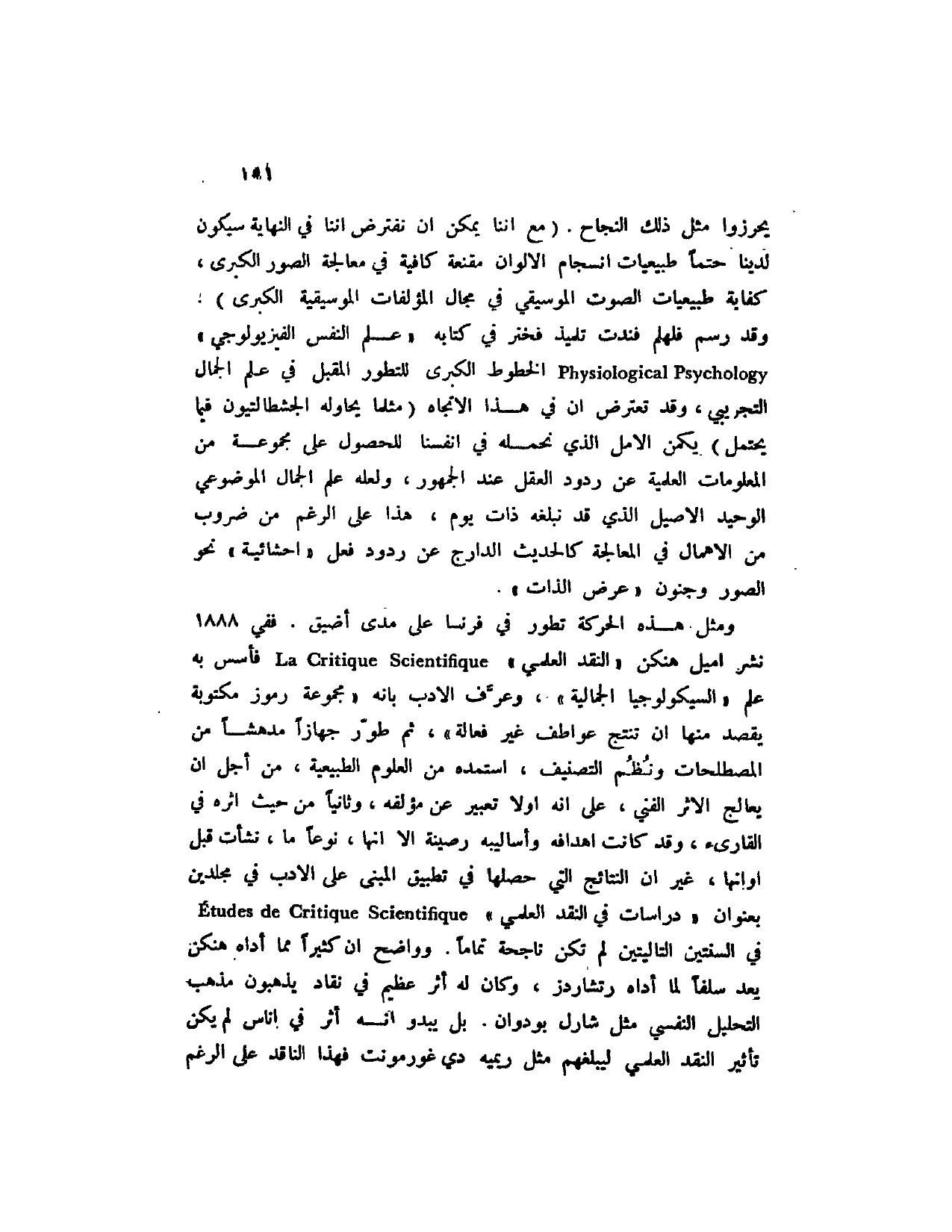 يحرزوا مثل ذلك النجاح. (مع إننا يمكن أن نفترض إننا في النهاية سيكون لدينا حتماً طبيعيات انسجام الألوان مقنعة كافية في معالجة الصور الكبرى، كفاية طبيعيات الصوت الموسيقي في مجال المؤلفات الموسيقية الكبرى) . وقد رسم فلهلم فندت تلميذ فخنر في كتابه " علم النفس الفيزيولوجي " Physiological Psychology الخطوط الكبرى للتطور المقبل في علم الجمال التجريبي، وقد تعترض أن هذا الاتجاه (مثلما يحاوله الجشطالتيون فيما يحتمل) يكمن الأمل الذي نحمله في أنفسنا للحصول على مجموعة من المعلومات العلمية عن ردود العقل عند الجمهور، ولعله علم الجمال الموضوعي الوحيد الأصيل الذي قد نبلغه ذات يوم، هذا على الرغم من ضروب من الإهمال في المعالجة كالحديث الدارج عن ردود فعل " أحشائية " نحو الصور وجنون " عرض الذات ".