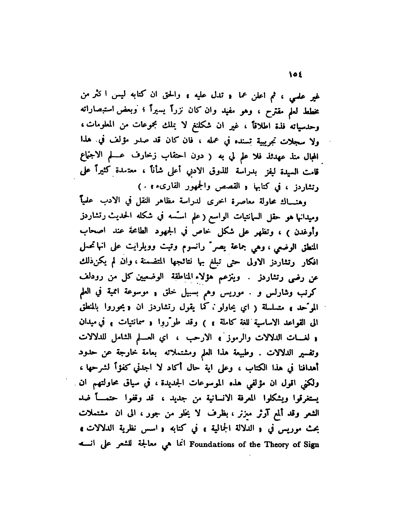 وهناك محاولة معاصرة أخرى لدراسة مظاهر النقل في الأدب علمياً وميدانها هو حقل السمانتيات الواسع (علم أسسه في شكله الحديث رتشاردز وأوغدن) ، وتظهر على شكل خاص في الجهود الطامحة عند أصحاب المنطق الوضعي، وهي جماعة يصر رانسوم وتيت وويلرايت على أنها تحمل أفكار رتشاردز الأولى حتى تبلغ بها نتائجها المتضمنة، وان لم يكن ذلك عن رضى رتشاردز. ويتزعم هؤلاء المناطقة الوضعيين كل من رودلف كرمب وشارلس و. موريس وهم بسبيل خلق " موسوعة أممية في العلم الموحد " متسلسلة (أي يحاولون كما يقول رتشاردز ان " يحوروا بالمنطق إلى القواعد الأساسية للغة كاملة ") وقد طوروا " سمانتيات " في ميدان " لغات الدلالات والرموز " الأرحب، أي العلم الشامل للدلالات وتفسير الدلالات. وطبيعة هذا العلم ومشتملاته بعامة خارجة عن حدود أهدافنا في هذا الكتاب، وعلى أية حال أكاد لا أجدني كفؤاً لشرحها، ولكني أقول أن مؤلفي هذه الموسوعات الجديدة، في سياق محاولتهم أن يستغرقوا ويشكلوا المعرفة الإنسانية من جديد، قد وقفوا حتماً ضد الشعر وقد ألمع آرثر ميزنر، بظرف لا يخلو من جور، إلى أن مشتملات بحث موريس في " الدلالة الجمالية " في كتابه " أسس نظرية الدلالات " Foundations of the Theory of Sign إنما هي معالجة للشعر على انه