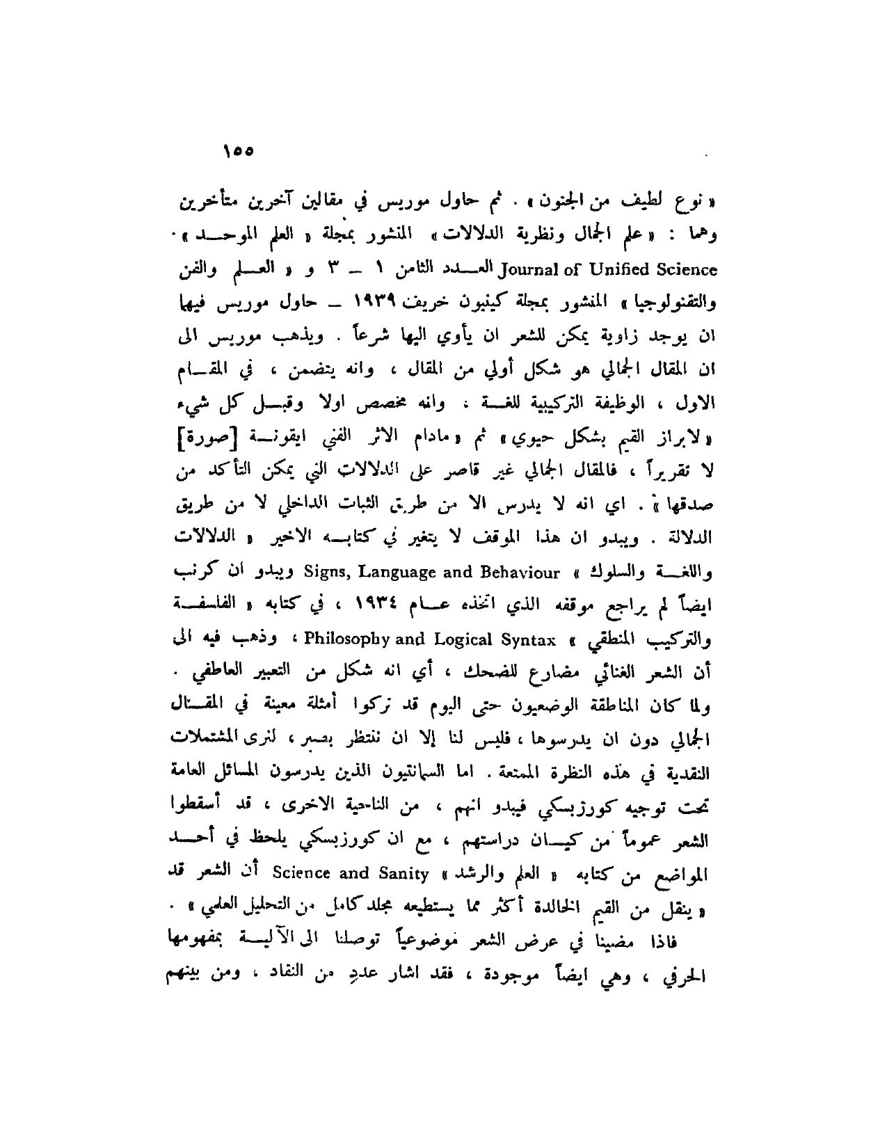" نوع لطيف من الجنون " ثم حاول موريس في مقالين آخرين متأخرين وهما: " علم الجمال ونظرية الدلالات " المنشور في مجلة " العلم الموحد " Journal of Unified Science العدد الثامن 1 - 3 و " العلم والفن والتقنولوجيا " المنشور بمجلة كينيون خريف 1939 - حاول موريس فيهما ان يوجد زاوية يمكن للشعر أن يأوي إليها شرعاً. ويذهب موريس إلى أن المقال الجمالي هو شكل أولي من المقال، وأنه يتضمن، في المقام الأول، الوظيفية التركيبية للغة، وإنه مخصص أولا وقبل كل شيء " لإبراز القيم بشكل حيوي " ثم " ما دام الأثر الفني إيقونة [صورة] لا تقرياً، فالمقال الجمالي غير قاصر على الدلالات التي يمكن التأكد من صدقها ". أي انه لا يدرس إلا من طريق الثبات الداخلي لا من طريق الدلالة. ويبدو أن هذا الموقف لا يتغير في كتابه الأخير " الدلالات واللغة والسلوك " Signs، Language an Behaviour ويبدو أن كرنب أيضاً لم يراجع موقفه الذي اتخذه عام 1934، في كتابه " الفلسفة والتركيب المنطقي " Philosophy and Logical Syntax، وذهب فيه إلى ان الشعر الغنائي مضارع للضحك، أي أنه شكل من التعبير العاطفي. ولما كان المناطقة الوضعيون حتى اليوم قد تركوا أمثلة معينة في المقال الجمالي دون أن يدرسوها، فليس لنا إلا ان ننتظر بصبر، لنرى المشتملات النقدية في هذه النظرة الممتعة. أما السمانتيون الذين يدرسون المسائل العامة تحت توجيه كورزبسكي فيبدو انهم، من الناحية الأخرى، قد اسقطوا الشعر عموماً من كيان دراستهم، مع أن كورزبسكي يلحظ في أحد المواضع في كتابه " العلم والرشد " Science and Sanity أن الشعر قد " ينقل من القيم الخالدة اكثر مما يستطيعه مجلد كامل من التحليل العلمي ".