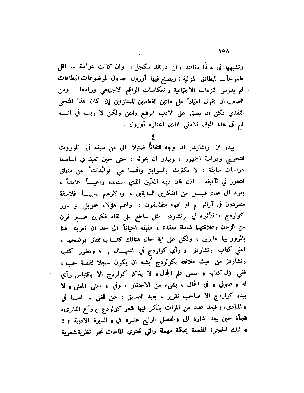 - يبدو أن رتشاردز قد وجه التفاتاً ضئيلا إلى من سبقه في الموروث التجريب ودراسة الجمهور، ويبدو أن بحوثه، حتى حين تعيد في أساسها دراسات سابقة، لا تكترث بالسوابق وإنما هي تولدت عن منطق التطور في تأليفه. إذن فان دينه المعين الذي استمده واعياً عامداً، يعود إلى عدد قليل من المفكرين السابقين، وأكثرهم نسبياً فلاسفة متفردون في آرائهم أو أدباء متفلسفون، وأهم هؤلاء صمويل تيلور كولردج، فتأثيره في رتشاردز مثل ساطع على لقاء فكرين عبر قرن من الزمان وعلاقتهما شاملة معقدة، دقيقة أحياناً إلى حد أن تغرينا هنا بالمرور بها عابرين، ولكن على أية حال هنالك كتاب ممتاز يوضحها، أعني كتاب رتشاردز " رأي كولردج في الخيال "؛ وتطور كتب رتشاردز من حيث علاقته بكولردج يشبه أن يكون سجلا لقصة حب، ففي أول كتابه " أسس علم الجمال " لا يذكر كولردج إلا باقتباس رأي له " صوفي " في الجمال، بشيء من الاحتقار، وفي " معنى المعنى " لا يبدو كولردج غلا صاحب تقرير، بعيد التحليق، عن الفن. أما في " المبادئ " فبعد عدد من المرات يذكر فيها شعر كولردج يروع القارئ فجأة حين يجد إشارة إلى " الفصل الرابع عشر " في " السيرة الأدبية ": " تلك الحجرة المفعمة بحكمة مهملة والتي تحتوي الماعات نحو نظرية شعرية