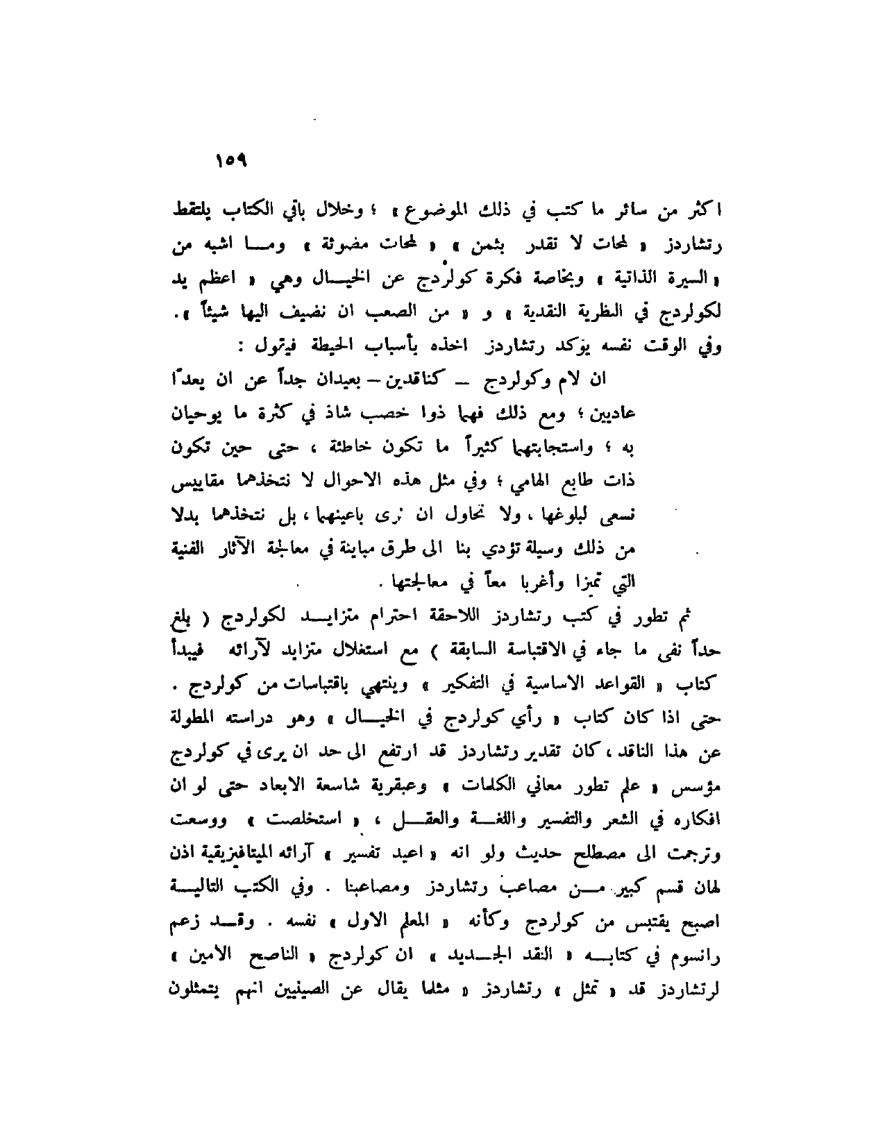 أكثر من سائر ما كتب في ذلك الموضوع "؛ وخلال باقي الكتاب يلتقط رتشاردز " لمحات لا تقدر بثمن " " لمحات مضوئة " وما أشبه من " السيرة الذاتية " وبخاصة فكرة كولردج عن الخيال وهي " اعظم يد لكولردج في النظرية النقدية " و " من الصعب أن نضيف إليها شيئاً ". وفي الوقت نفسه يؤكد رتشاردز أخذه بأسباب الحيطة فيقول: