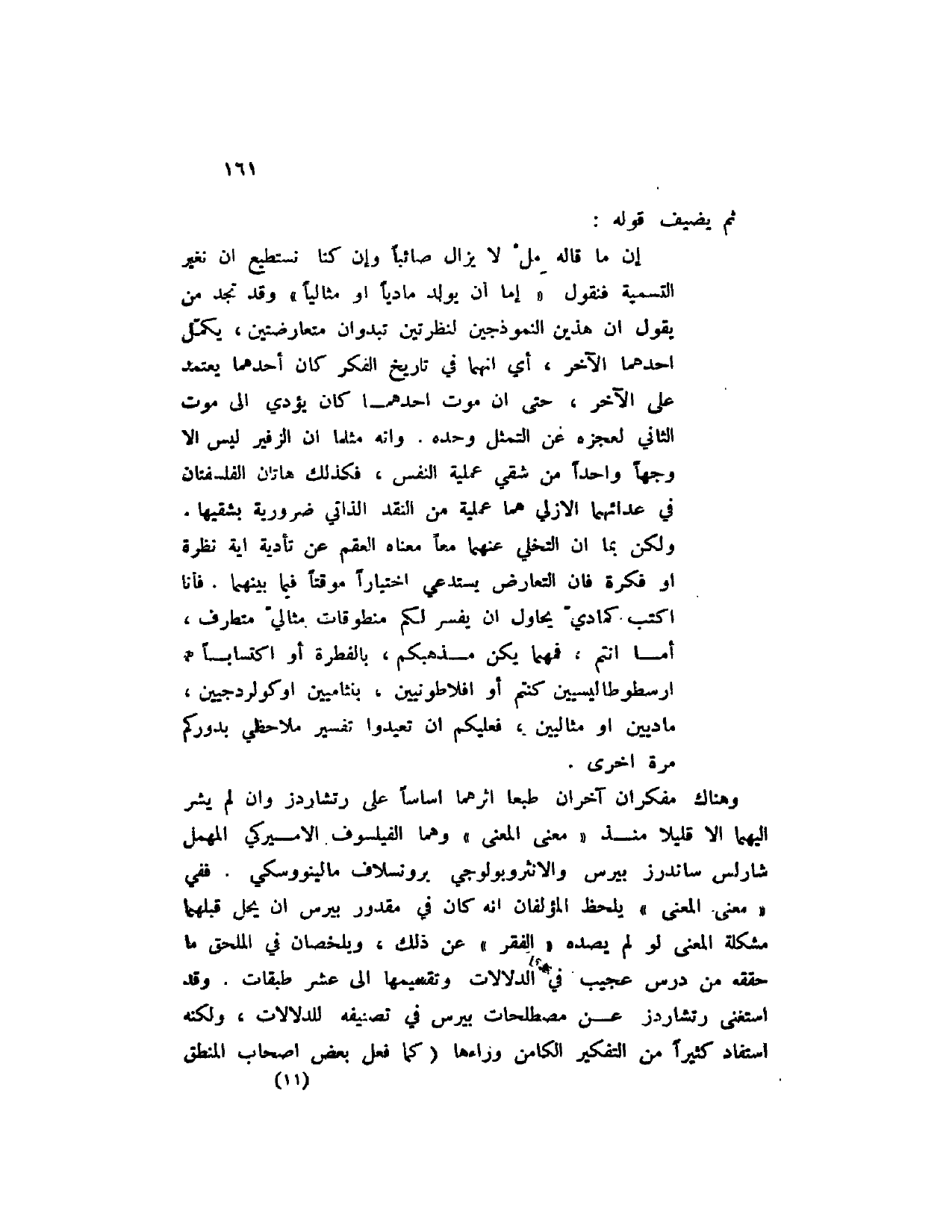 وهناك مفكران آخران طبعاً أثرهما أساساً على رتشاردز وان لم يشر إليهما إلا قليلا منذ " معنى المعنى " وهما الفيلسوف الأميركي المهمل شارلس ساندرز بيرس والأنثروبولوجي برونسلاف مالينووسكي. ففي " معنى المعنى " يلحظ المؤلفان انه كان في مقدور بيرس أن يحل قبلهما مشكلة المعنى لو لم يصده " الفقر " عن ذلك، ويلخصان في الملحق ما استغنى رتشاردز عن مصطلحات بيرس في تصنيفه للدلالات، ولكنه استفاد كثيراً من التفكير الكامن وراءها (كما فعل بعض أصحاب المنطق