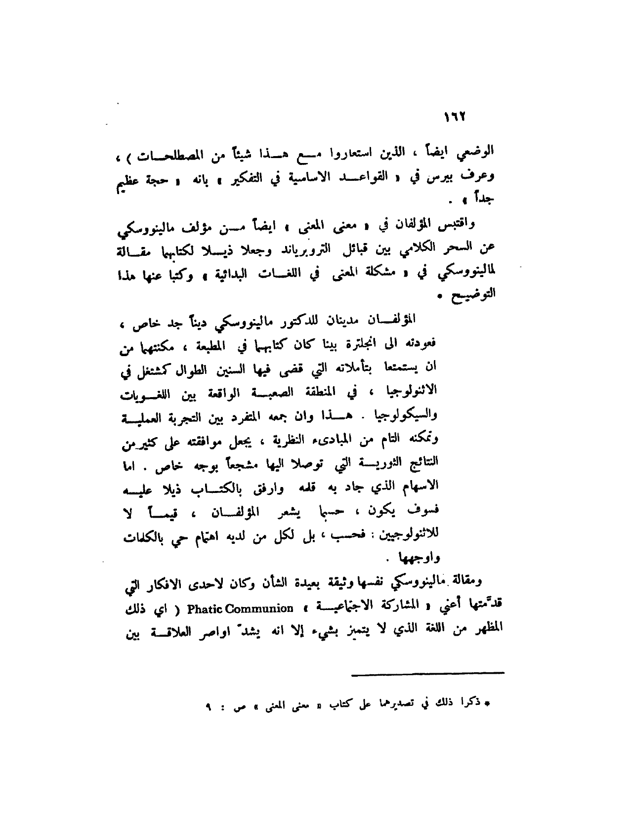 ومقالة مالينووسكي نفسها وثيقة بعيدة الشان وكان لإحدى الأفكار التي قدمتها أعني " المشاركة الاجتماعية " Phatic Communion (أي ذلك المظهر من اللغة الذي لا يتميز بشيء إلا أنه يشد أواصر العلاقة بين